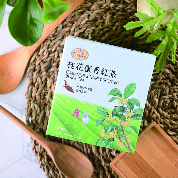 2.以全發酵、半球形的紅茶,調和金黃色的桂花,琥珀色茶湯帶有幽雅的蜜香與桂花香氣,茶韻甘醇柔和。