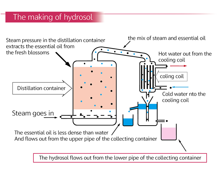 Hydrosolcontains the water-soluble constituents of the plant as well as microscopicdroplets of the essential oil.