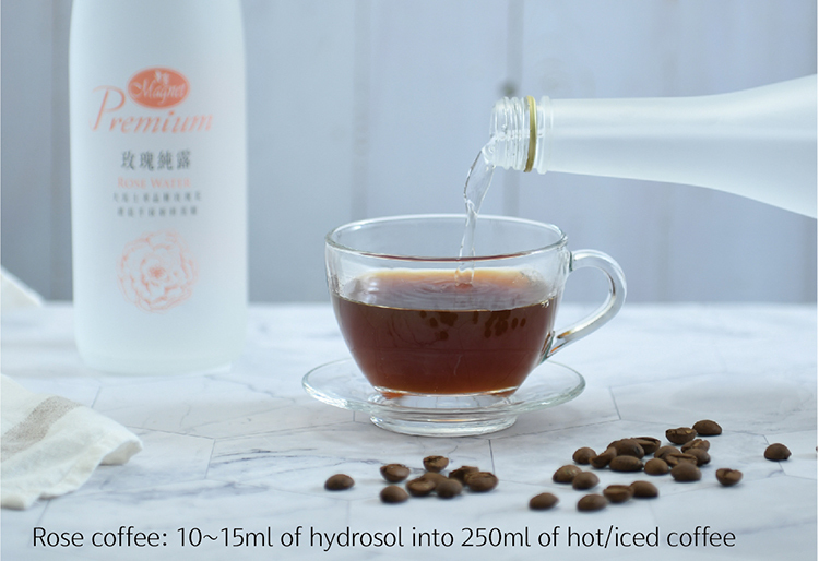Roseblack tea: 10~15ml of hydrosol into 300ml of hot/iced black tea