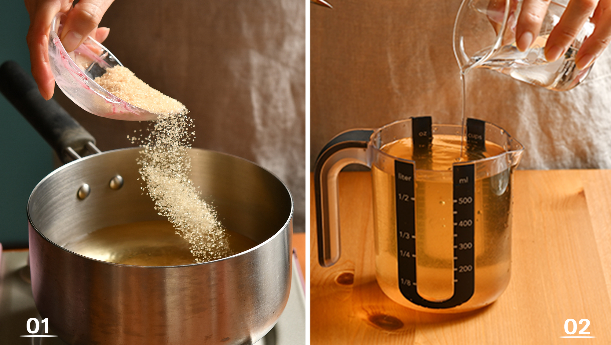 1. 玫瑰糖醋汁:將玫瑰純露以外的材料倒入小鍋中煮開,放涼後加入玫瑰純露。