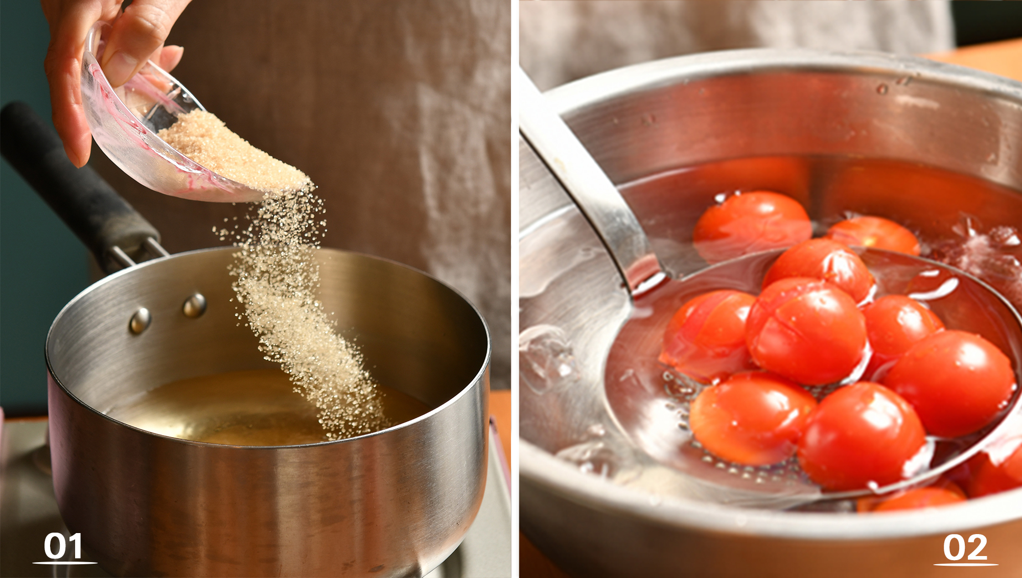 2. 將小番茄底部用利刀輕輕劃十字,放入滾水中煮30秒至1分鐘,小番茄表皮略掀起時撈起,放入冷水中降溫,輕輕撕去番茄皮。