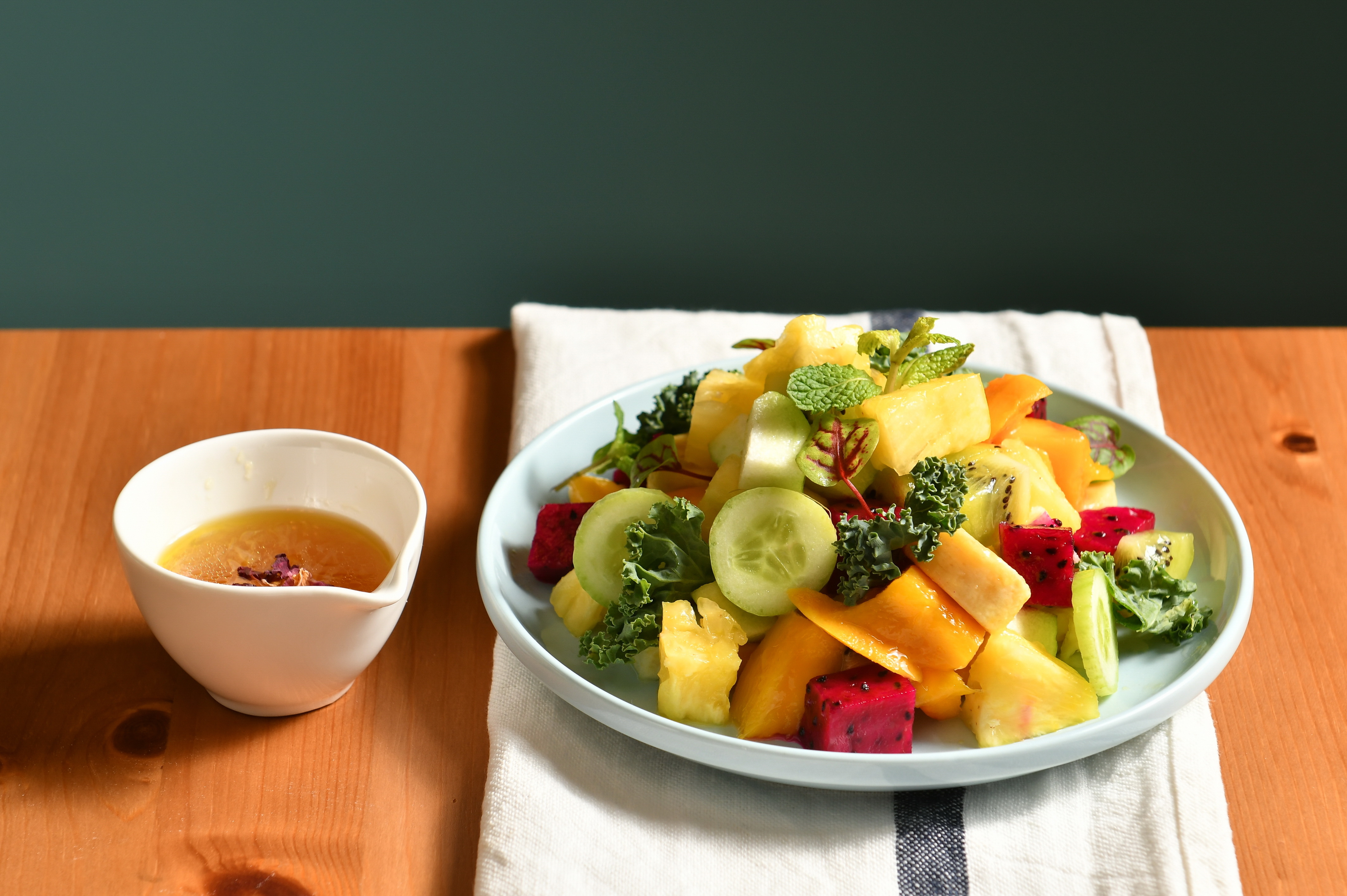 玫瑰油醋汁:檸檬汁1 大匙、楓糖漿1大匙、玫瑰純露1大匙、植物好油1/2大匙、鹽1/4 小匙。