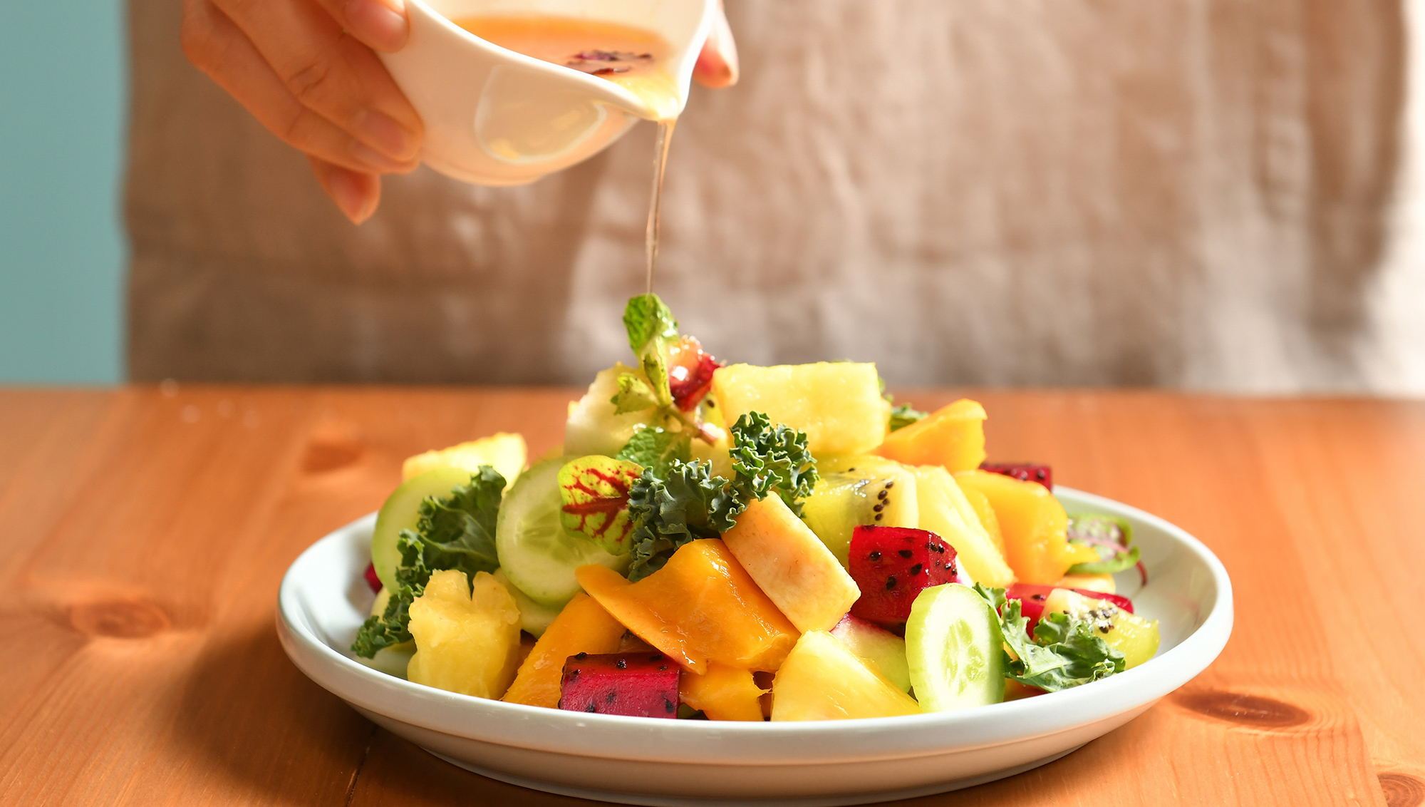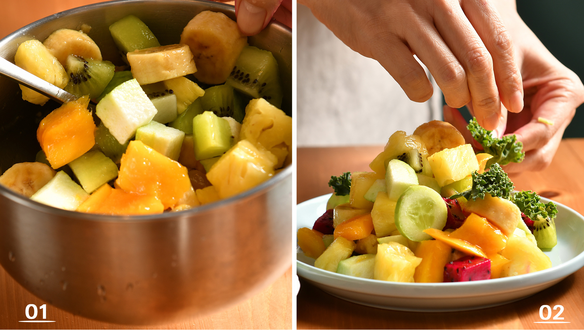 2. 將所有水果洗淨、切塊,混合後擺盤,點綴薄荷葉。