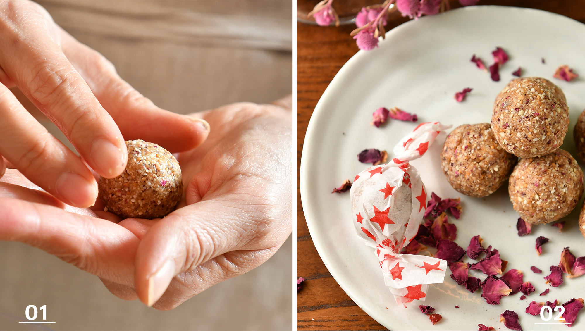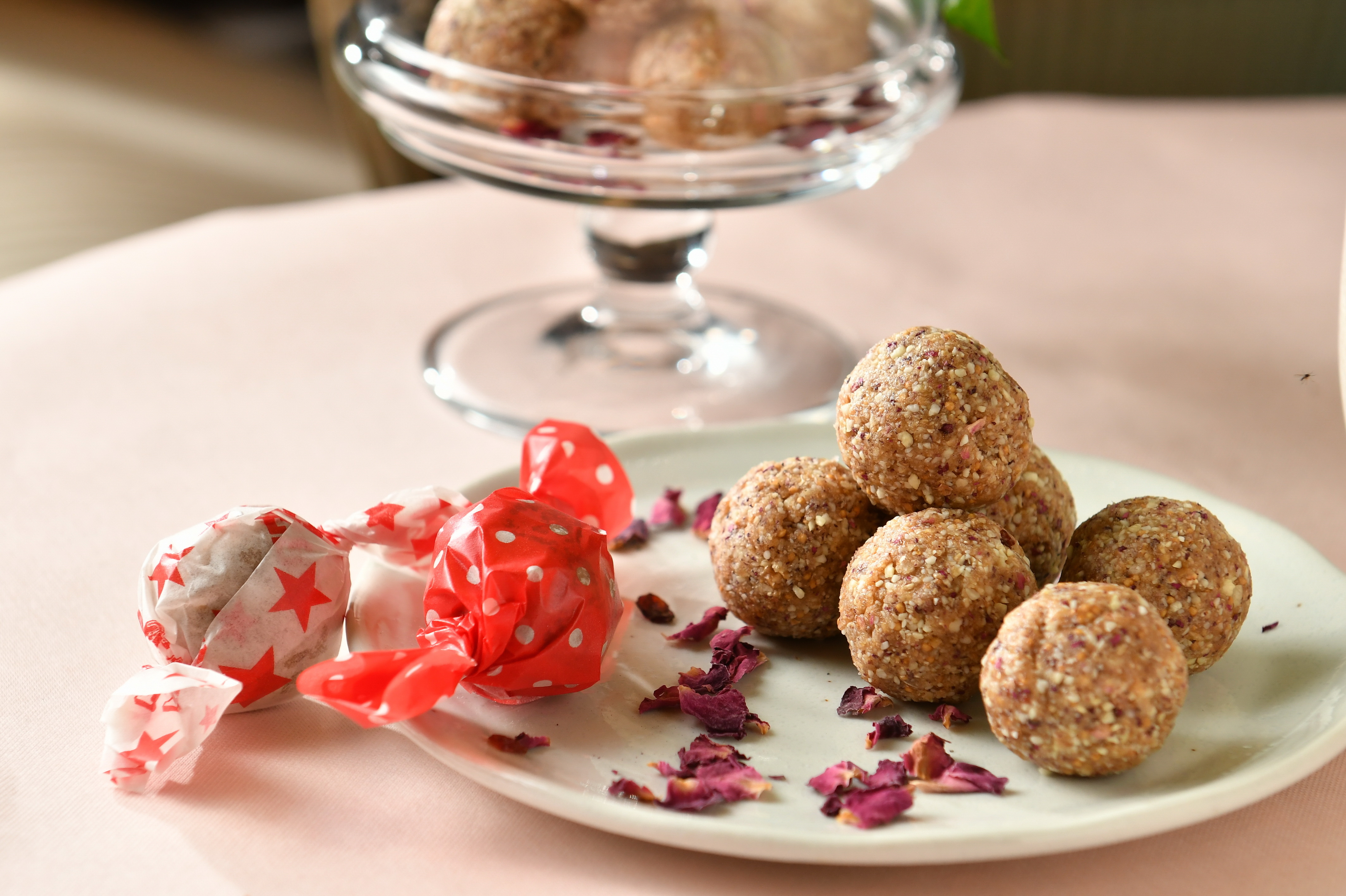 幸福球Bliss Ball又叫做精力球Energy Ball,外型可愛、色彩繽紛,與一般甜點不同處,只用天然食材製作,不額外添加糖,甜味來自於原味果乾,充滿玫瑰香氣的甜點,帶來滿滿的幸福感受!