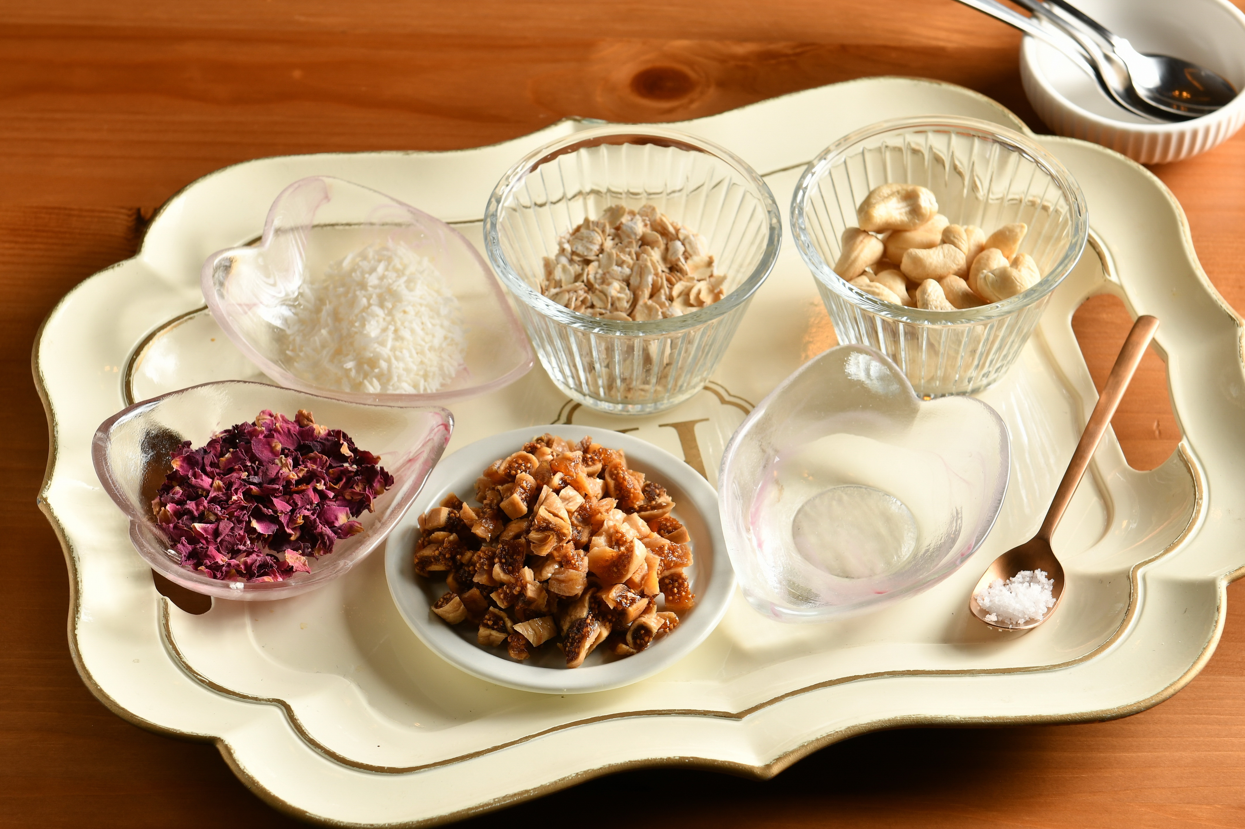 無花果果乾100g、玫瑰純露1大匙、燕麥片35g、椰子絲15g、生腰果100g、乾燥玫瑰花瓣3大匙(食用級)、岩鹽1小撮