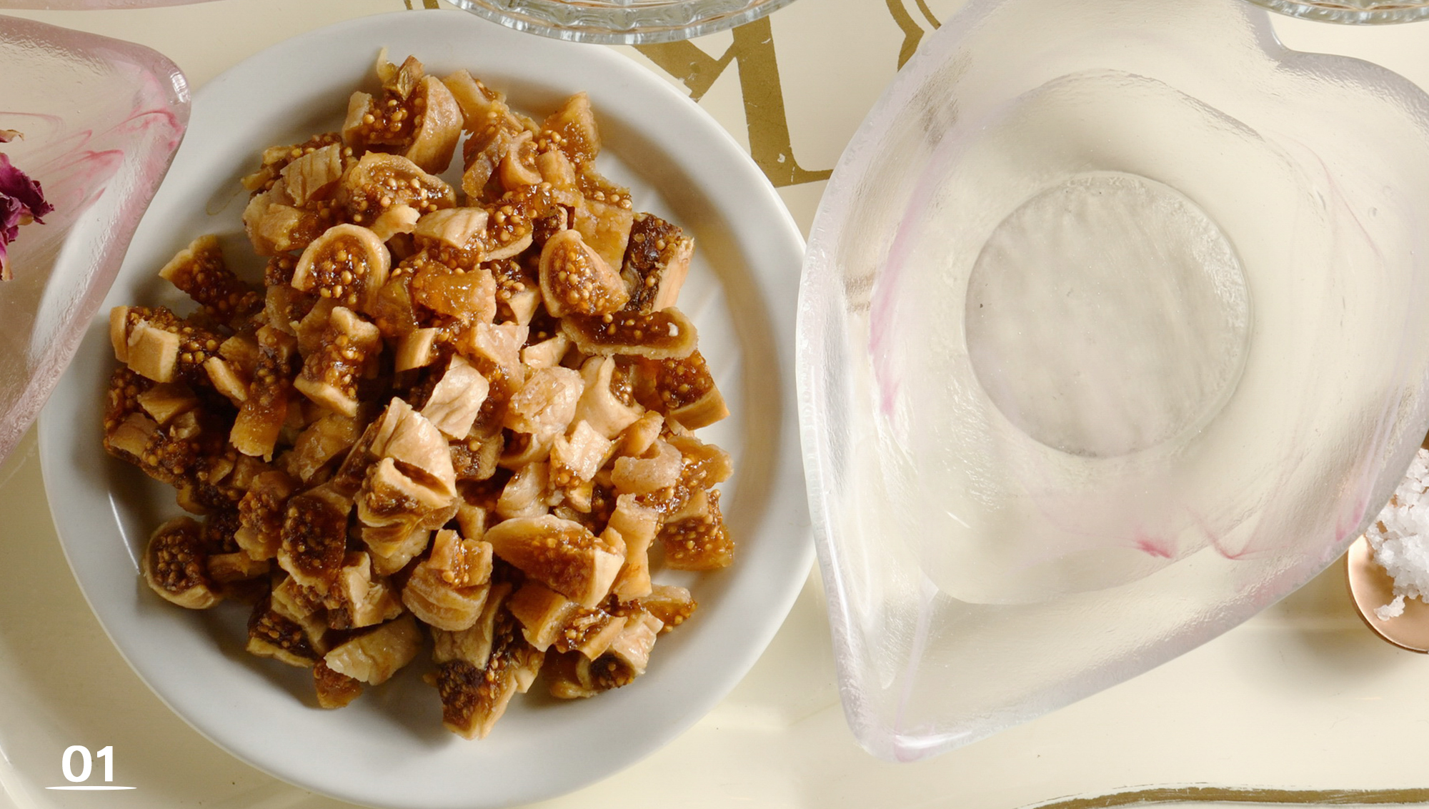 1. 無花果果乾切成小塊,加入玫瑰純露靜置15分鐘(讓果乾軟化好使用〉。