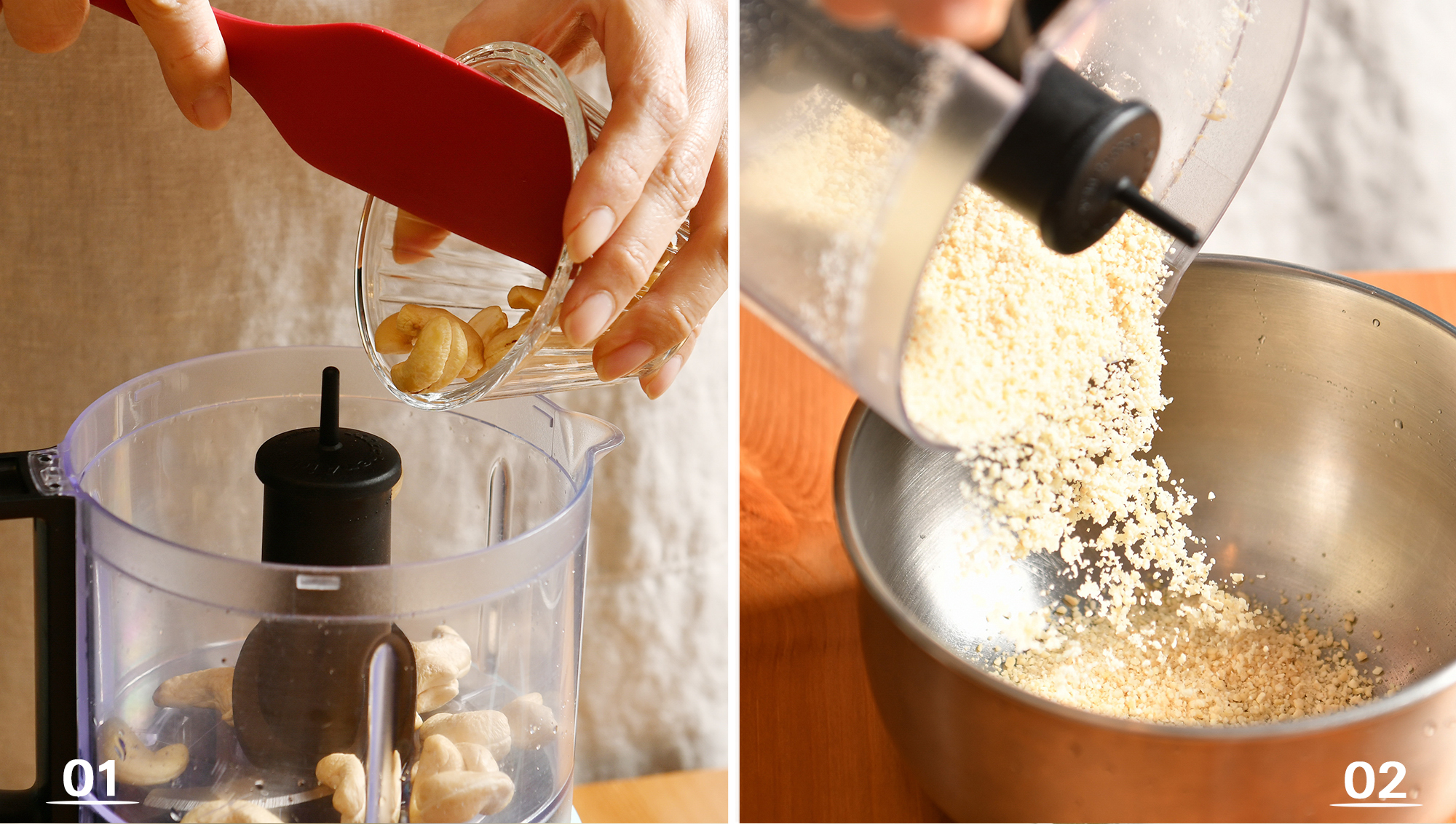 2. 將腰果以食物調理機打成細碎後,倒入鋼盆備用。