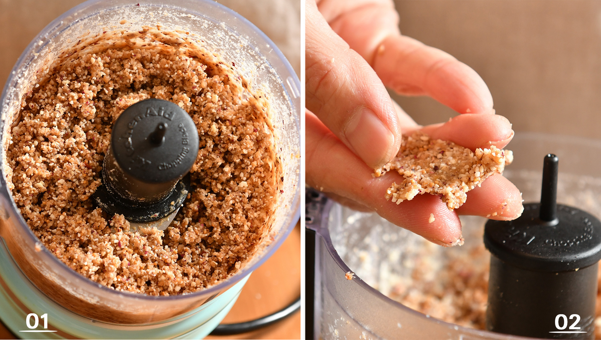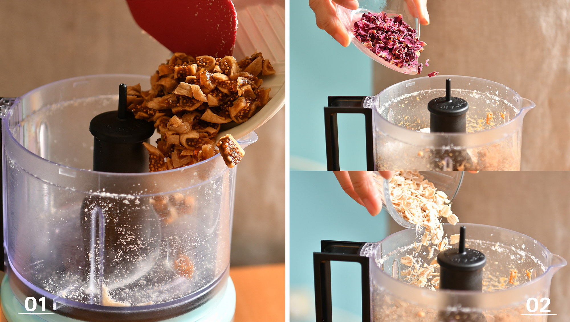 3. 無花果放入食物調理機攪打到細滑軟黏,加入燕麥片、椰子絲、玫瑰花瓣後繼續攪拌,最後加入腰果碎粒、岩鹽混合。