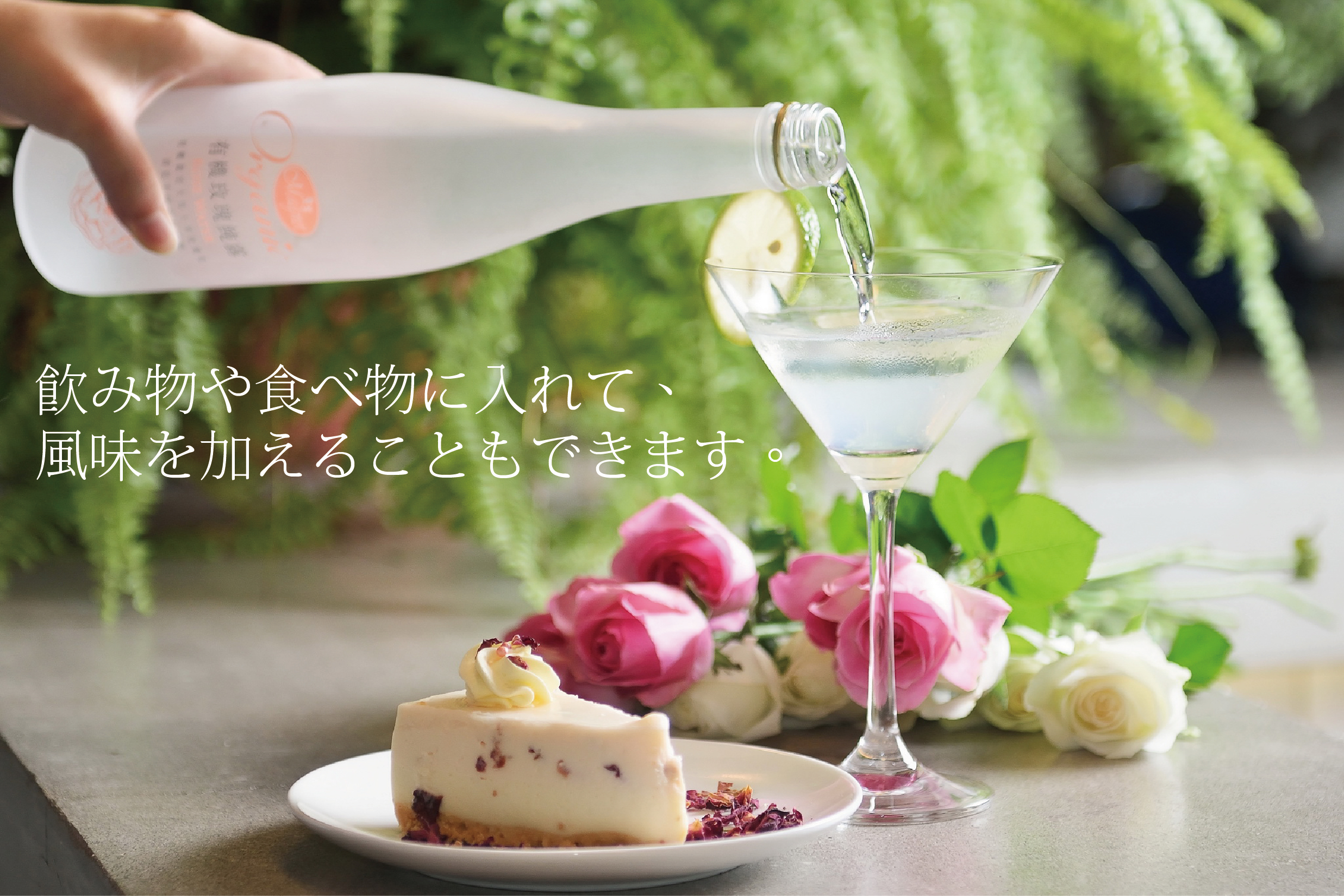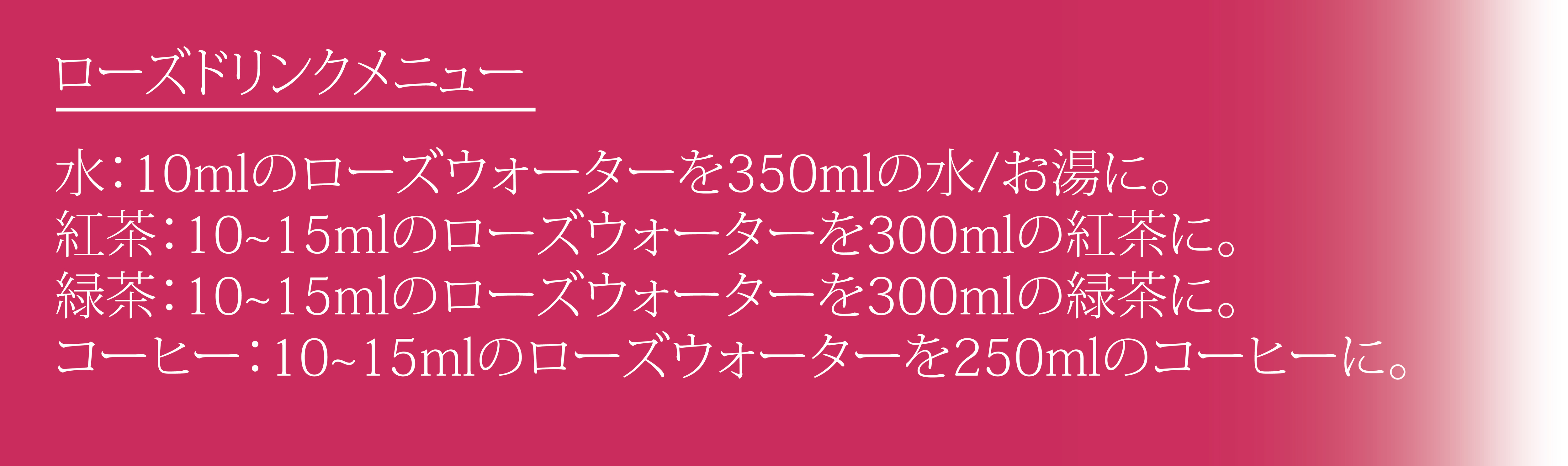 1ccのローズウォーターは約5つ分のローズの水溶性エッセンスを含んでおり、お口のエチケットにもよく、代謝を促進し美容にもよいと言われています。飲み物や食べ物に入れて、風味を加えることもできます。