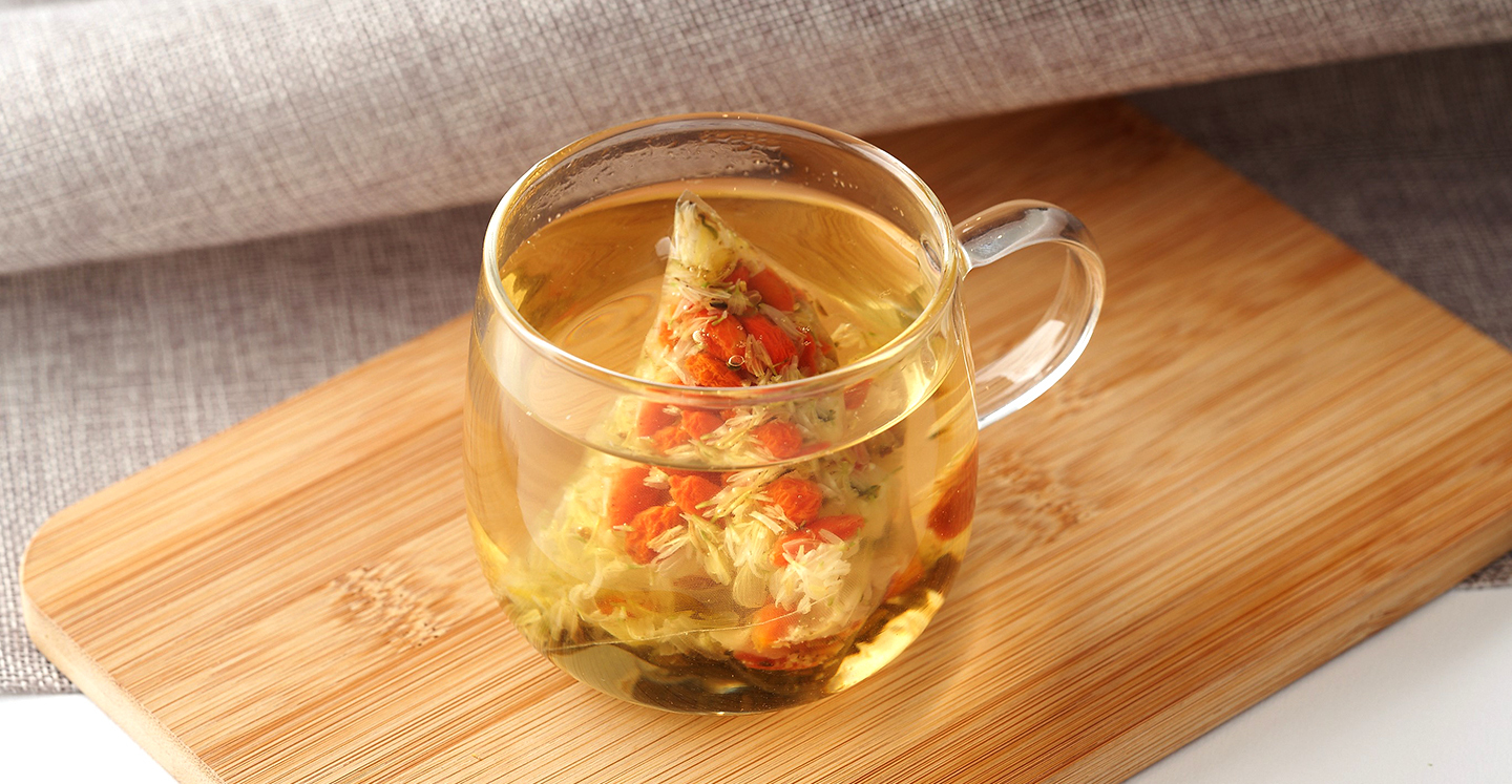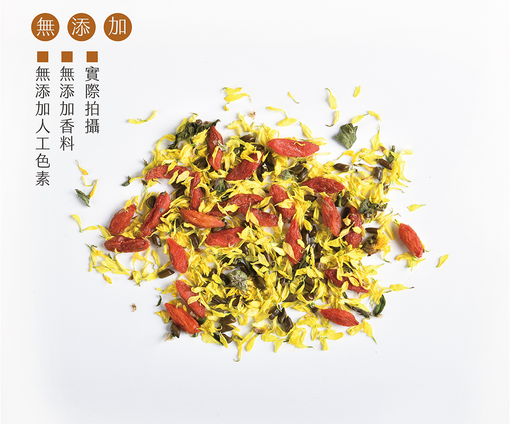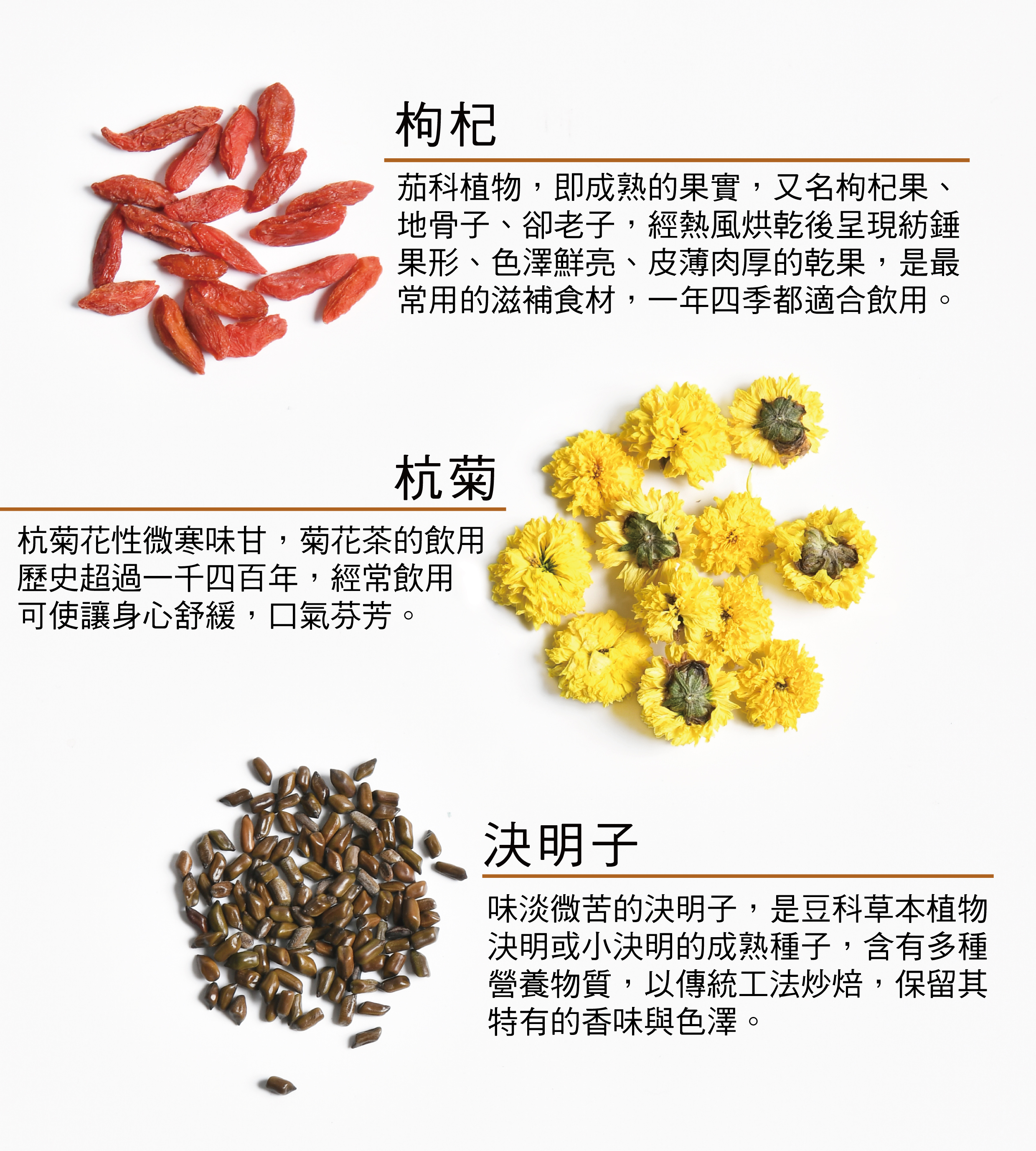 杭菊特有的清香、決明子溫潤, 接續枸杞的甘甜柔滑,尾韻帶出莓類果實的舒爽微酸。