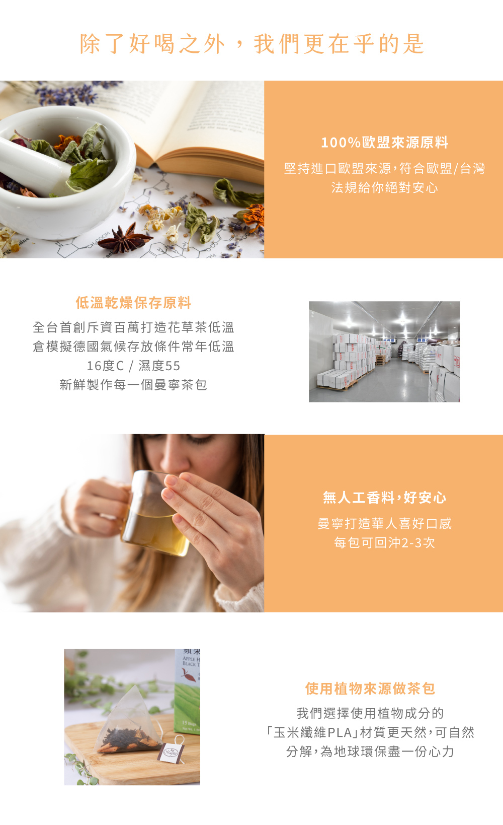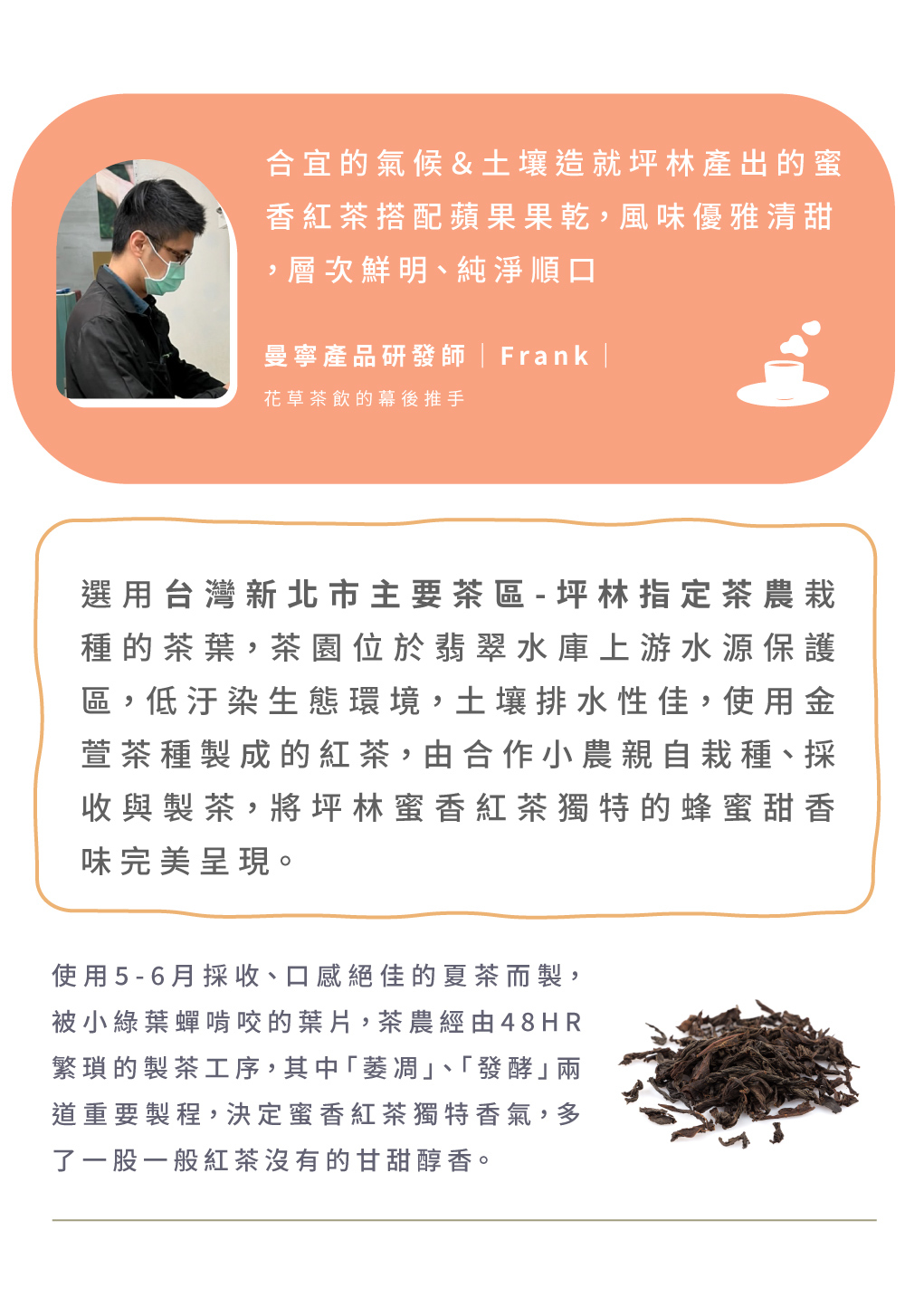 1.全發酵輕焙火的蜜香紅茶,調和香甜蘋果,口感圓潤輕甜