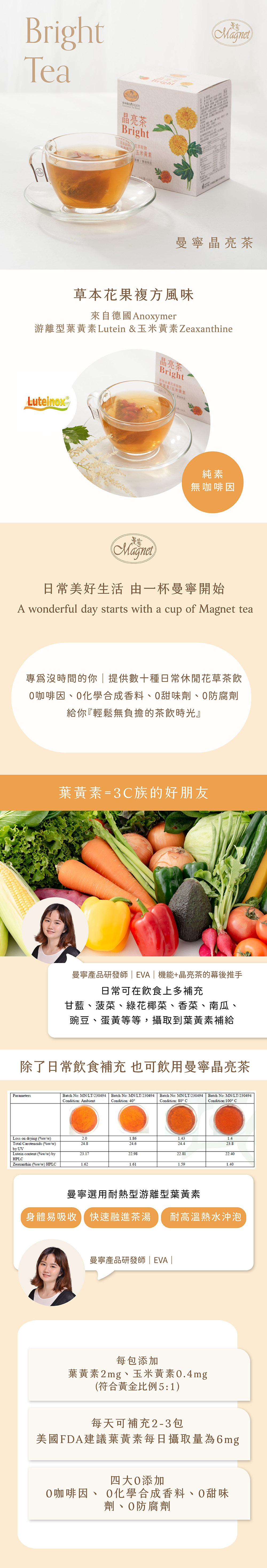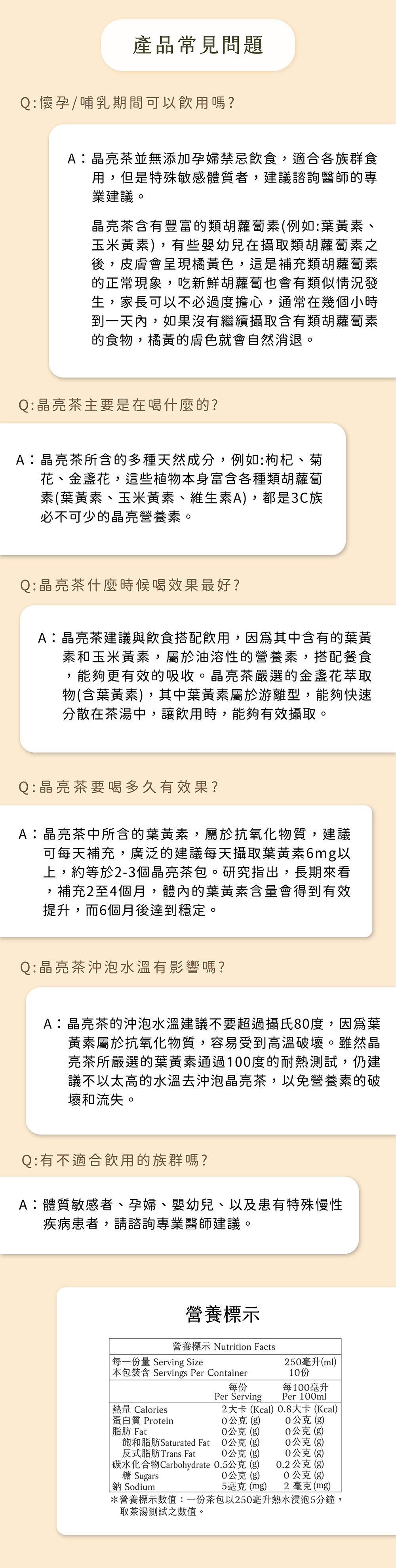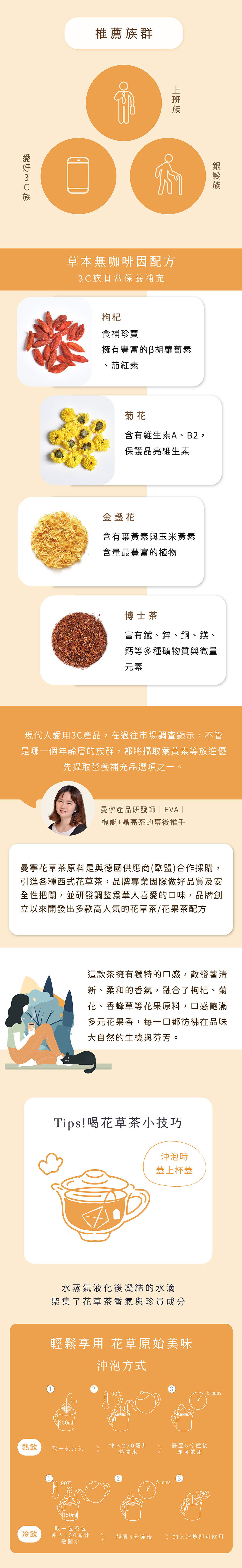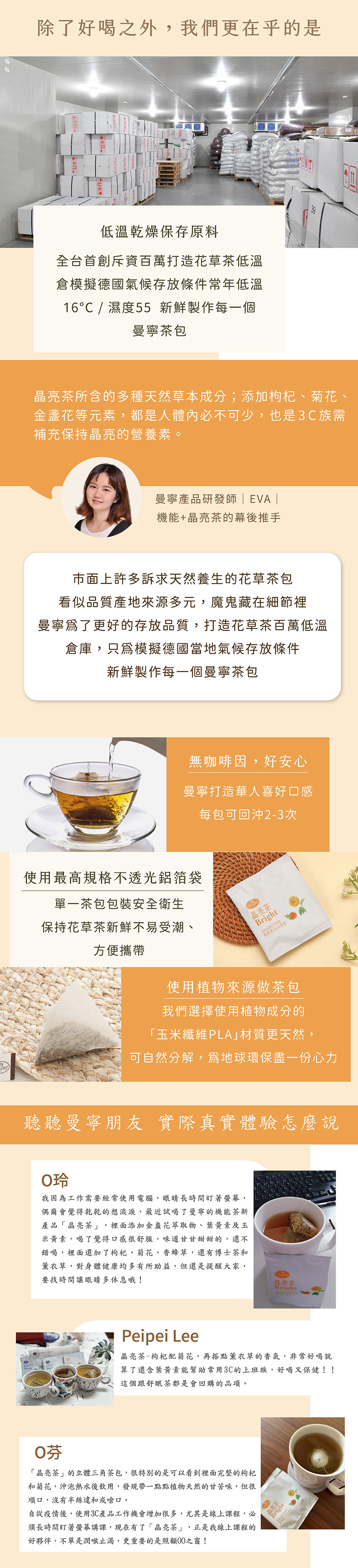 2.晶亮茶擁有獨特的口感,散發著清新、柔和的香氣,融合了枸杞、菊花、香蜂草等花果原料。