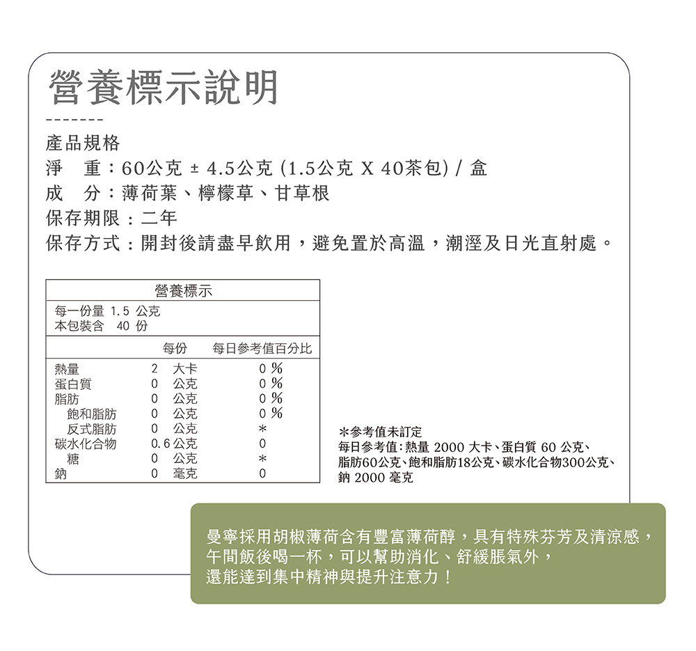 成 分:薄荷葉、甘草根、檸檬草