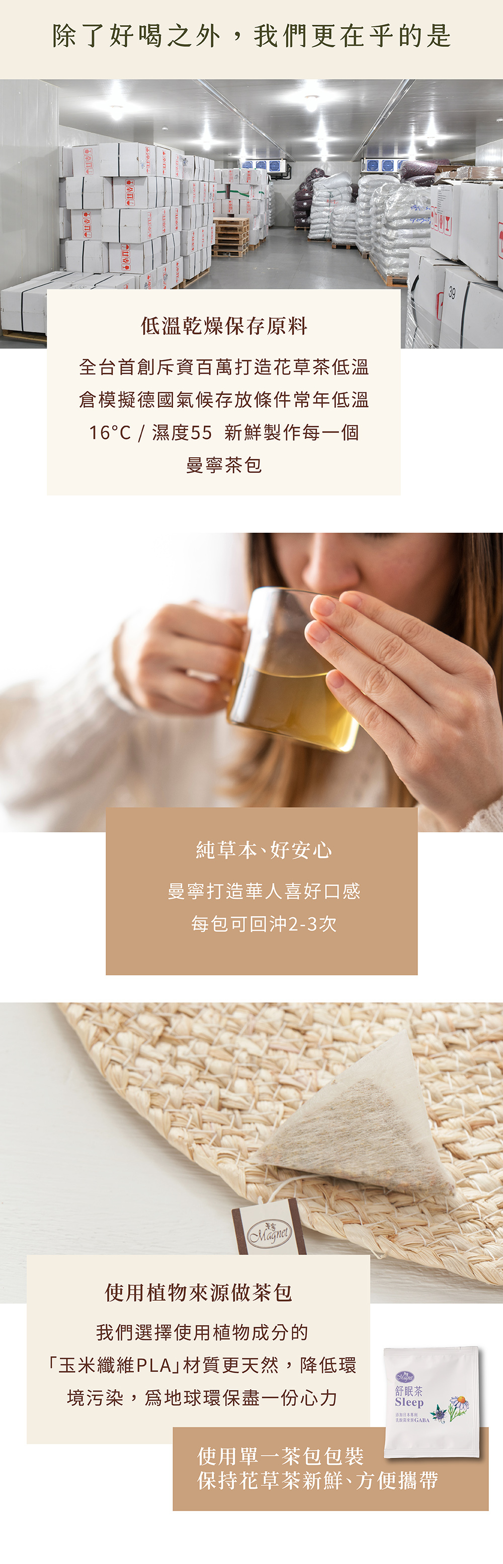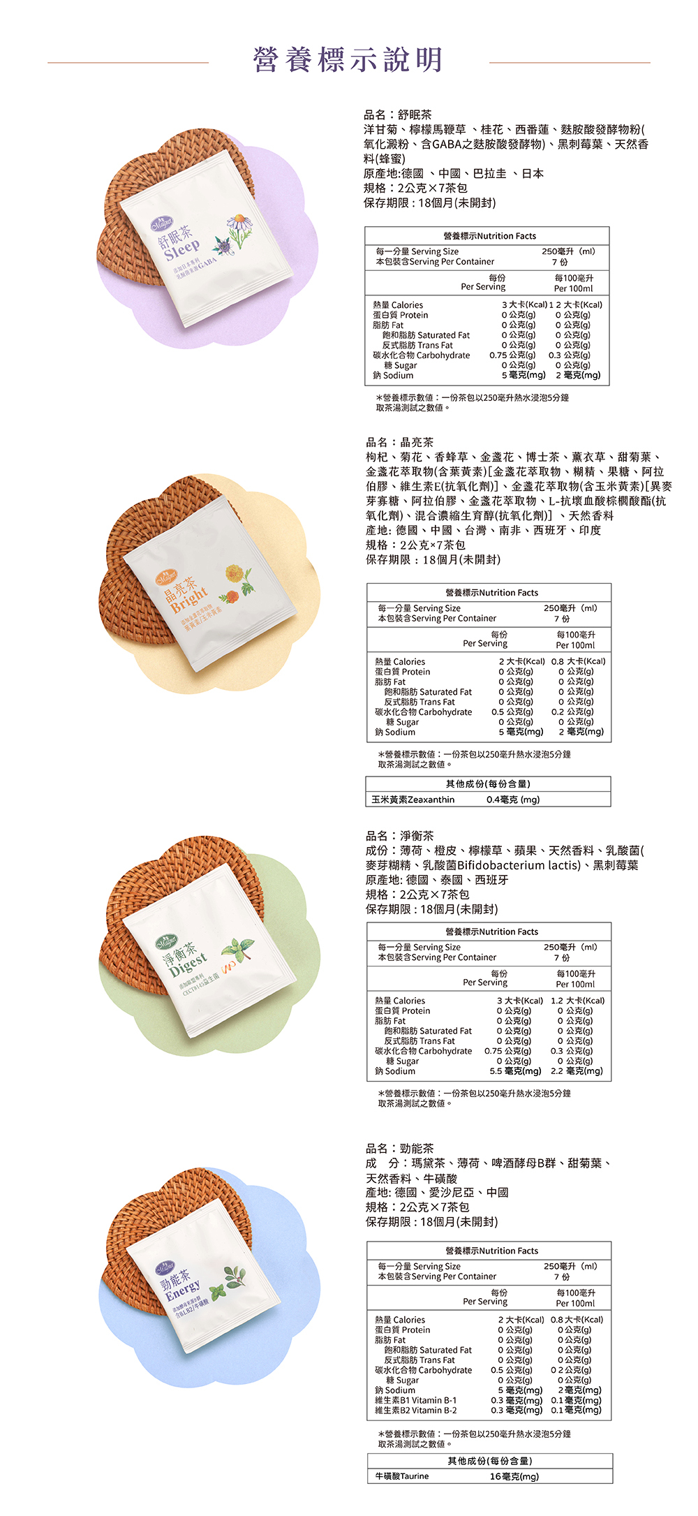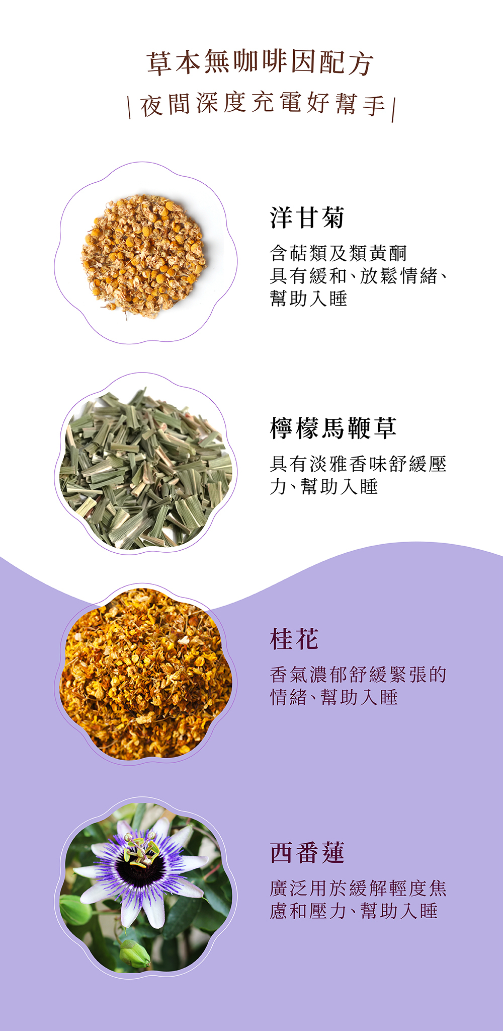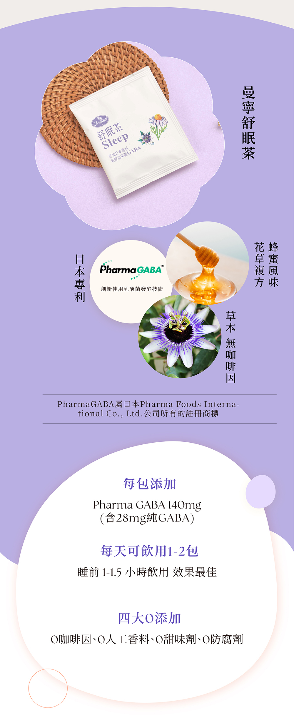 成份:洋甘菊、檸檬馬鞭草、桂花、西番蓮、麩胺酸發酵物粉(氧化澱粉、含GABA之麩胺酸發酵物)、黑刺莓葉、天然香料(蜂蜜)