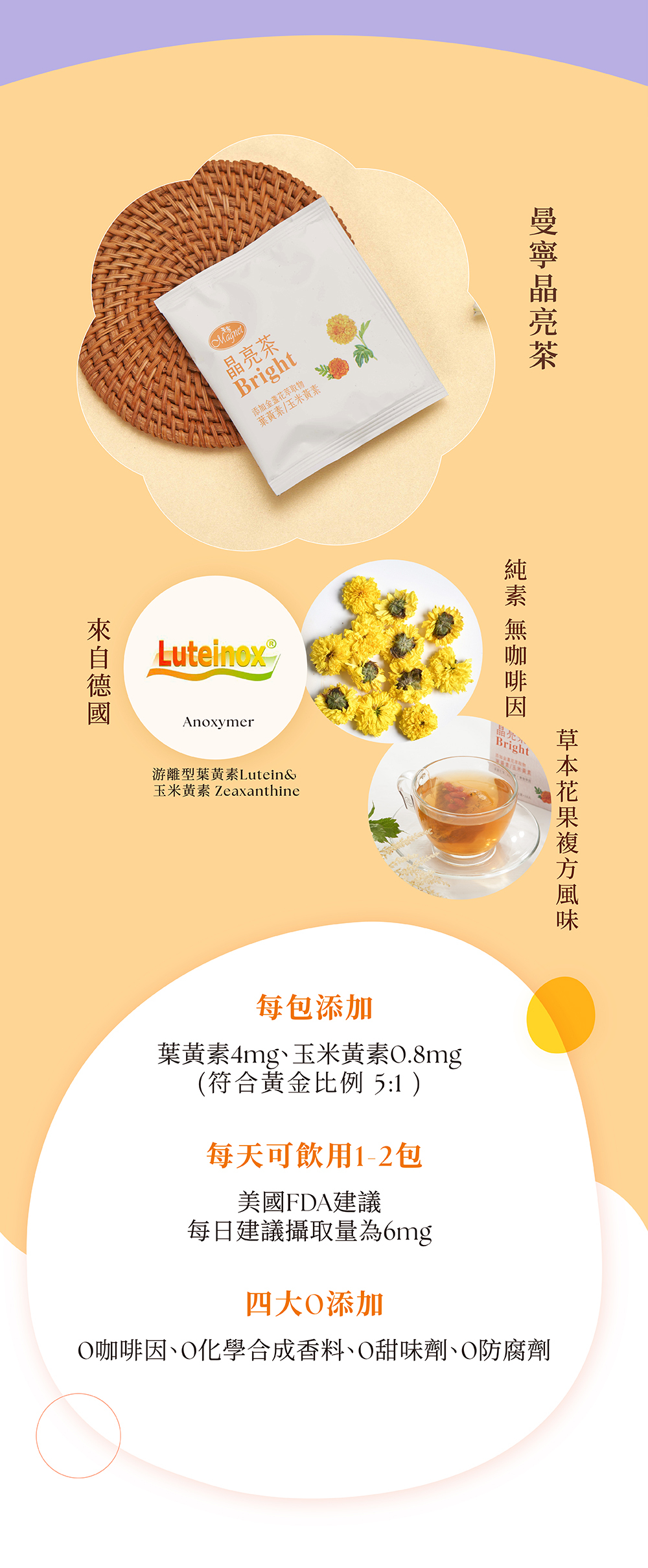 口感溫潤柔和,沖泡後釋放枸杞甘甜與菊花清香,添加萃取自金盞花,好吸收的游離型葉黃素與玉米黃素,保持水潤舒適、達成晶亮守護。