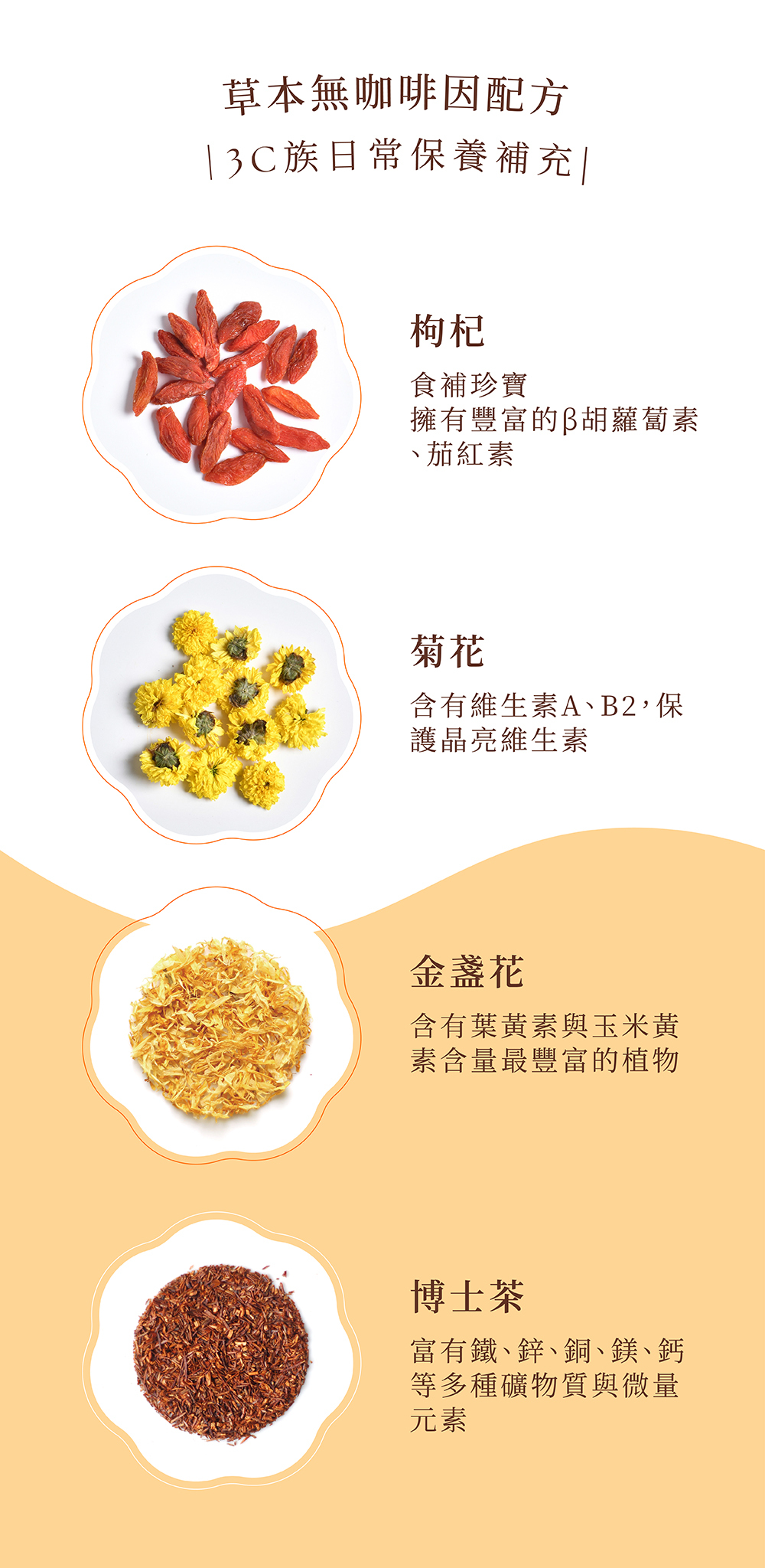 成份:枸杞、菊花、香蜂草、金盞花、博士茶、薰衣草、甜菊葉、金盞花萃取物(含葉黃素)[金盞花萃取物、糊精、果糖、阿拉伯膠、維生素E(抗氧化劑)]、金盞花萃取物(含玉米黃素)[異麥芽寡糖、阿拉伯膠、金盞花萃取物、L-抗壞血酸棕櫚酸酯(抗氧化劑)、混合濃縮生育醇抗氧化劑)] 、天然香料