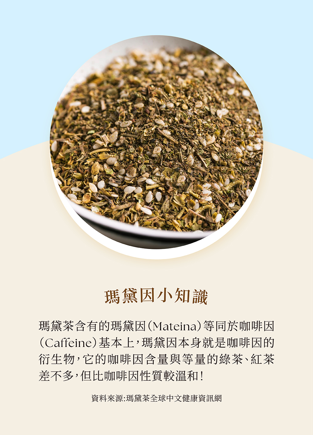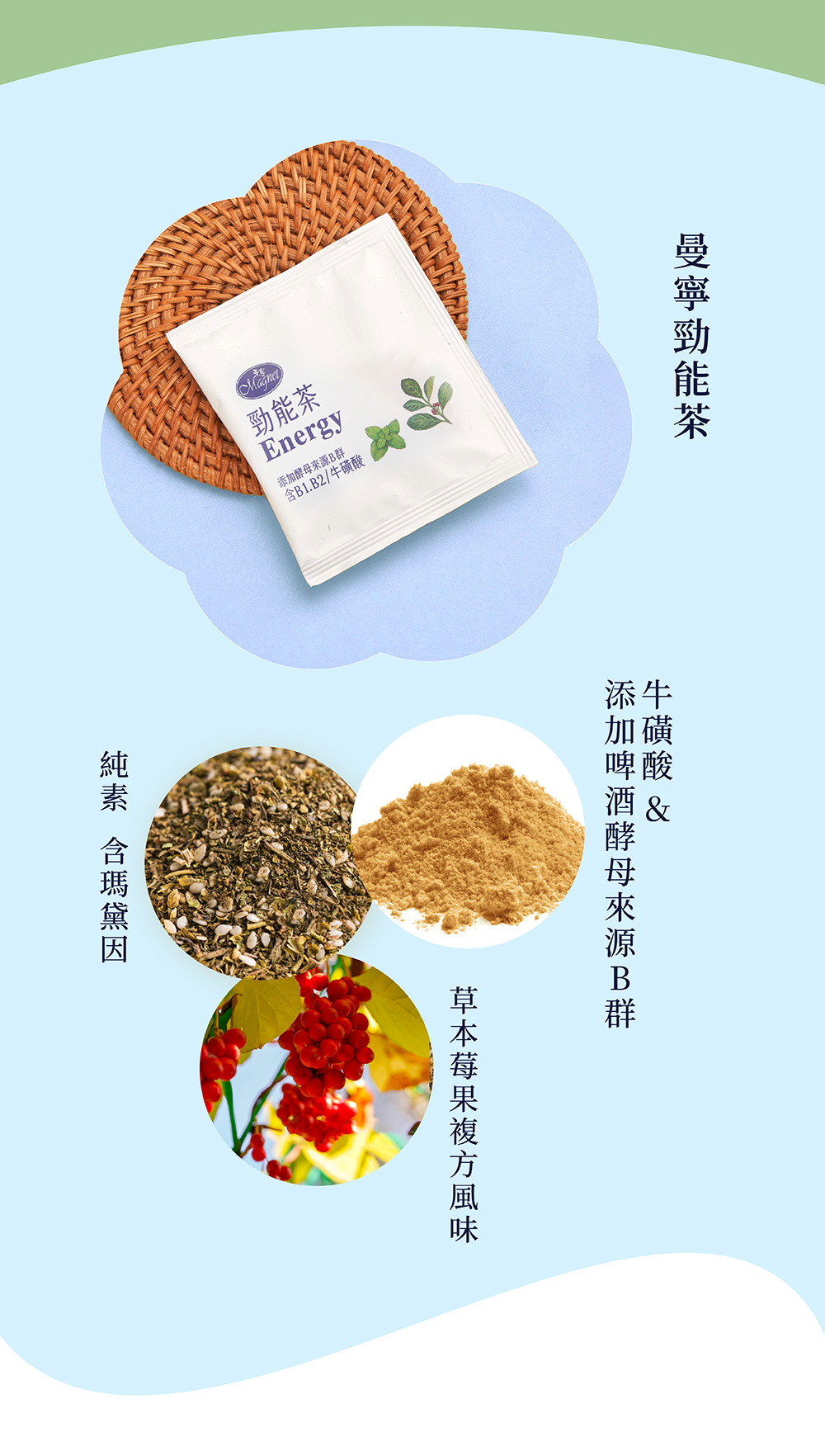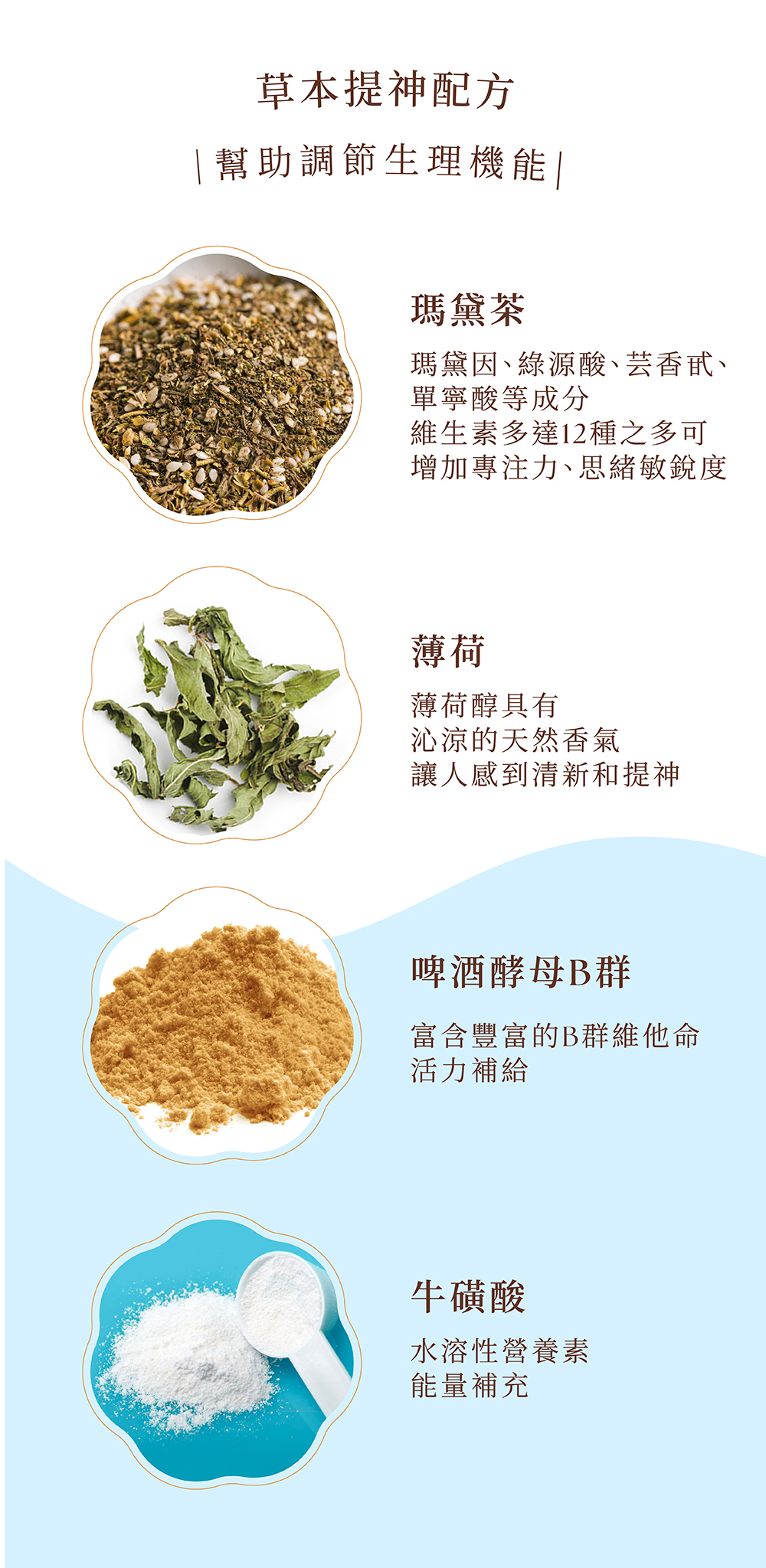 成份:瑪黛茶、薄荷、啤酒酵母B群、甜菊葉、天然香料、牛磺酸