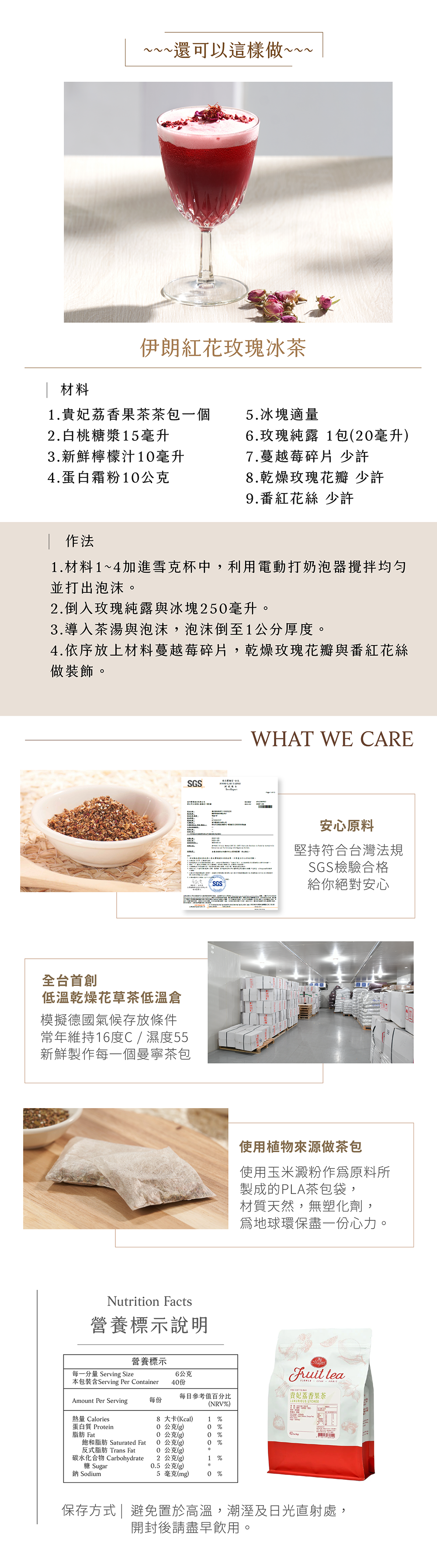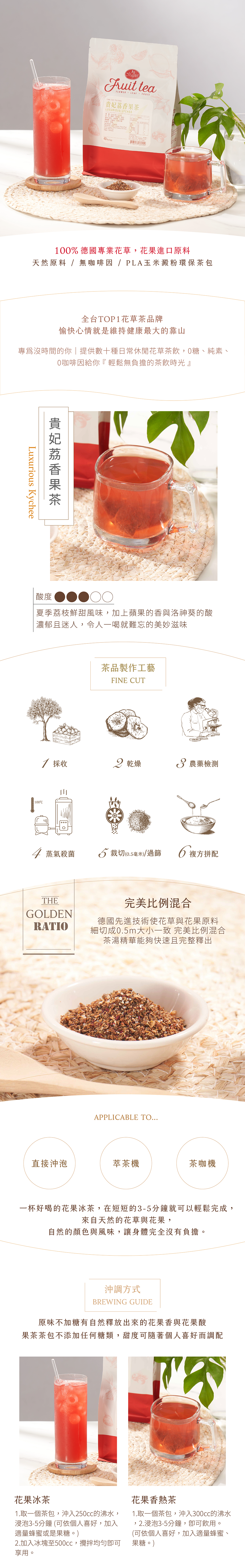 成分:蘋果、洛神葵、橙皮、香料(荔枝)、甜菊葉、玫瑰果、檸檬酸、水蜜桃、玫瑰花瓣