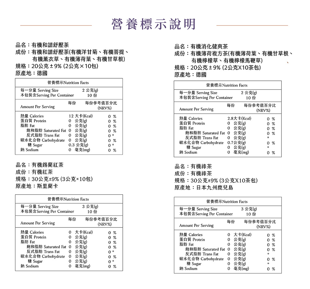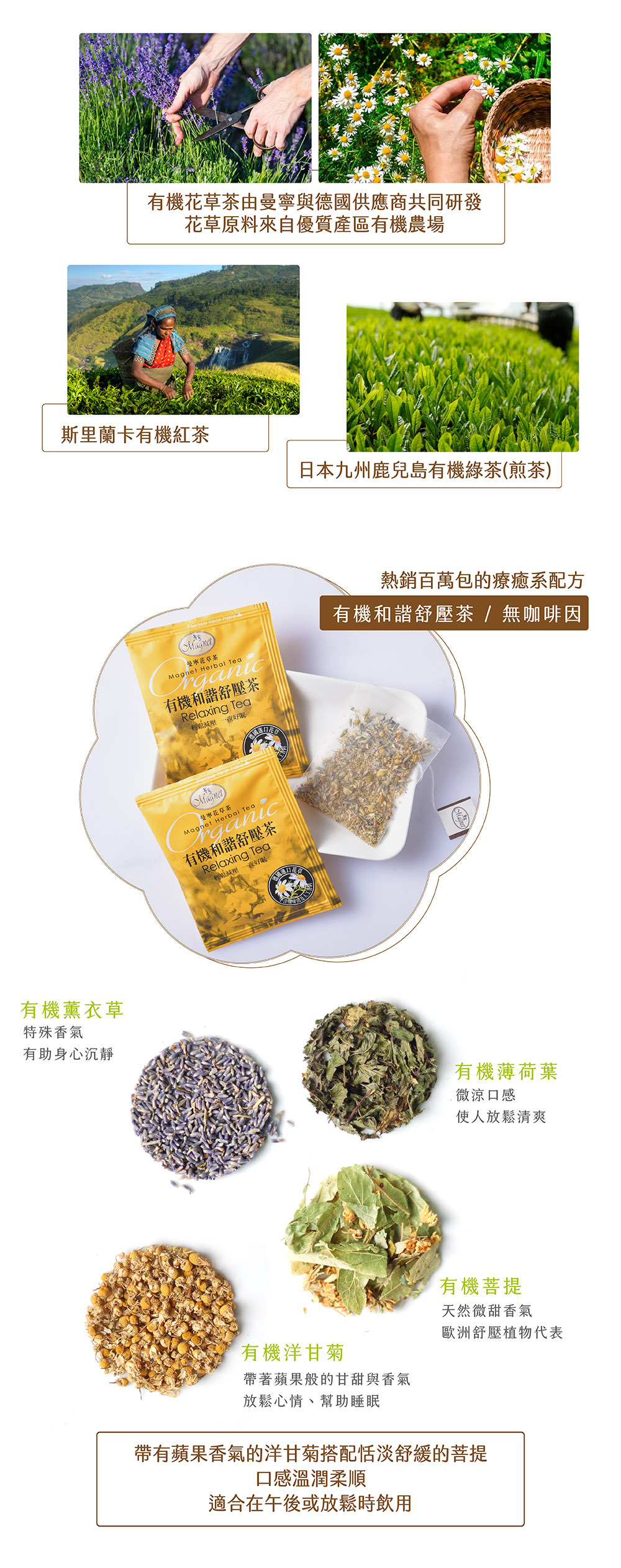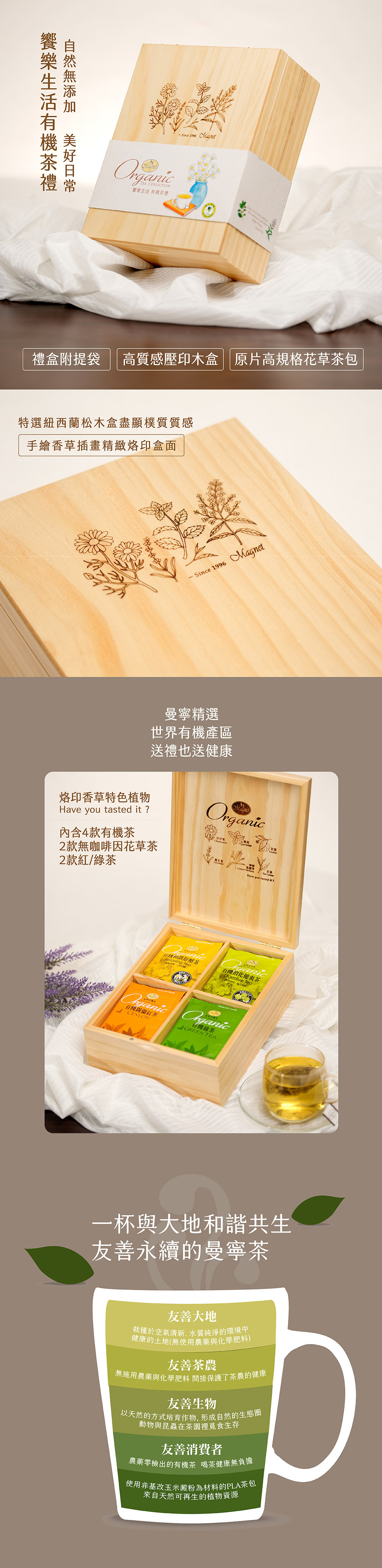 1.來自全球優質產區,植栽生產至茶包生產,全程有機的四款經典茶品 -2款有機複方花草茶與有機錫蘭紅茶及有機綠茶