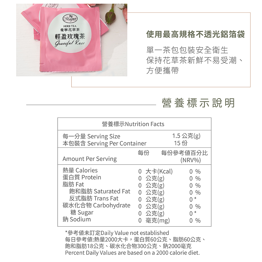 淨 重:30公克 ± 9% (2公克 X 15茶包) / 盒