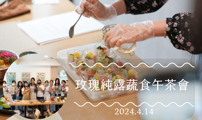 在豐腴可口、鮮嫩水靈的各式蔬食食材擺盤前方,開瑞老師從容且自信地分享關於這次玫瑰純露菜譜靈感發想來源...