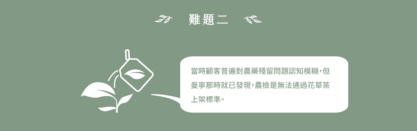 「曼寧」同樣踏在台灣的土地上,開始思考如何挖掘在地花草植物與西洋花草茶拚配成在地特色花草茶。於是曼寧在2008年開始深入產地調查台灣花草農業的特性,發現有幾道難題需要克服。