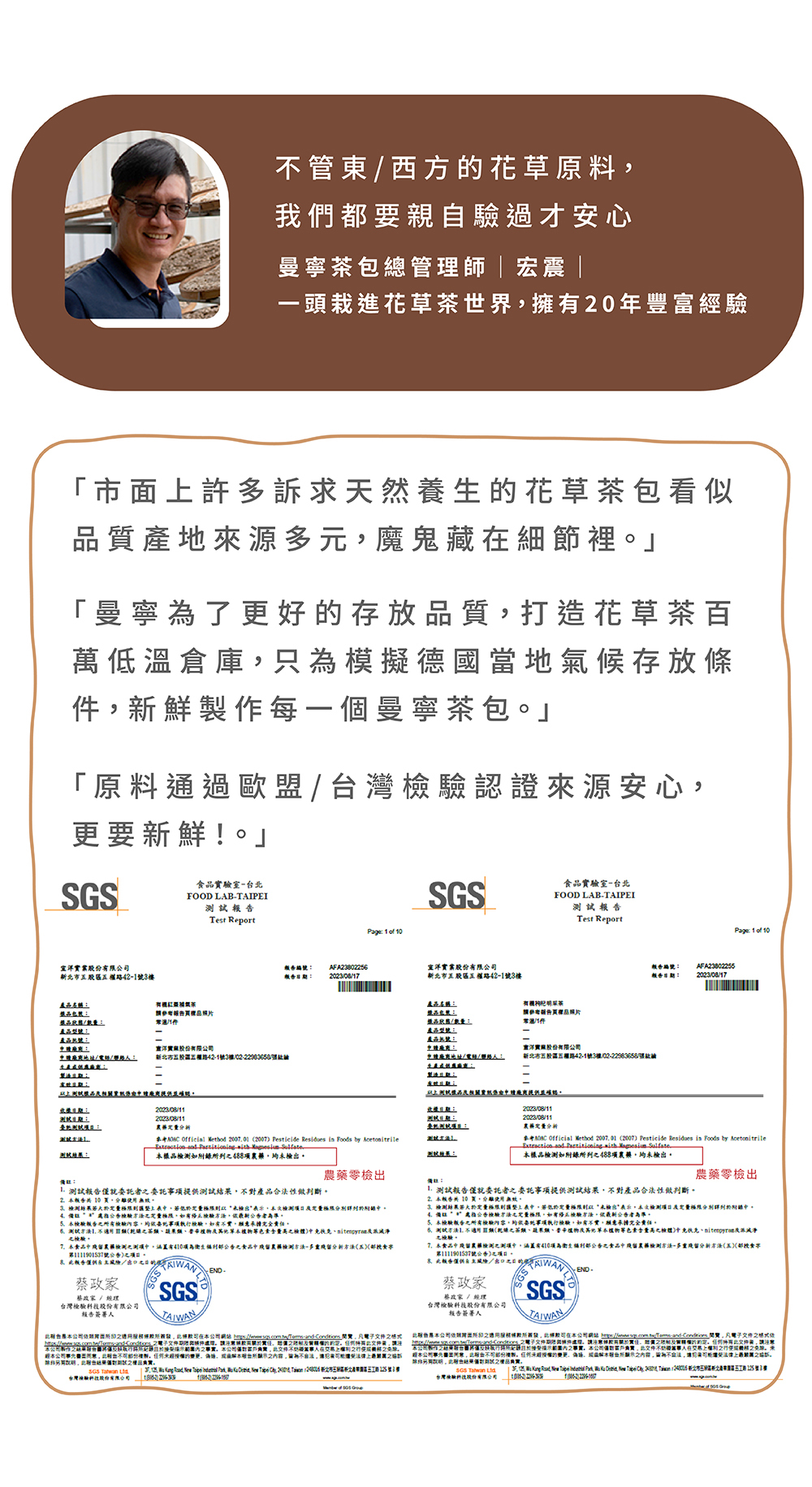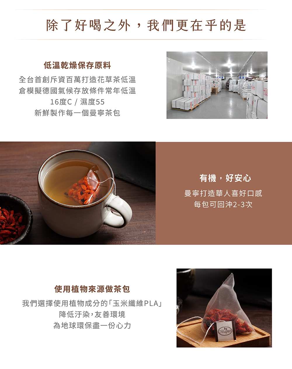 2. 曼寧專業研發特調,以東西方養身莓果複方拼配,不含咖啡因及香料,忠實呈現草本素材的自然原味。