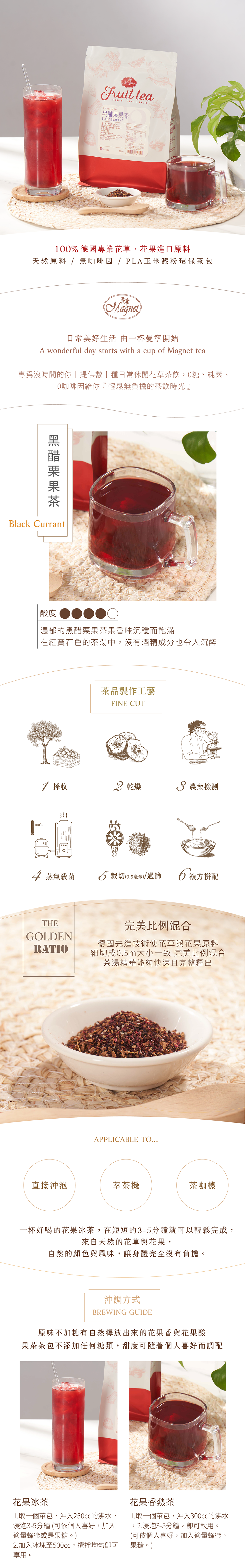 濃郁的黑醋栗果香味沉穩而飽滿,在紅寶石色的茶湯中,沒有酒精成分也令人沉醉。