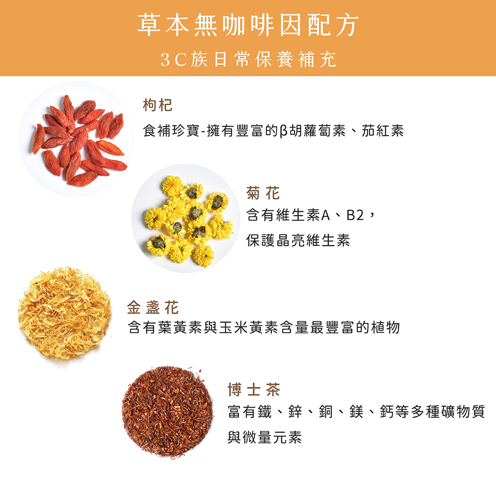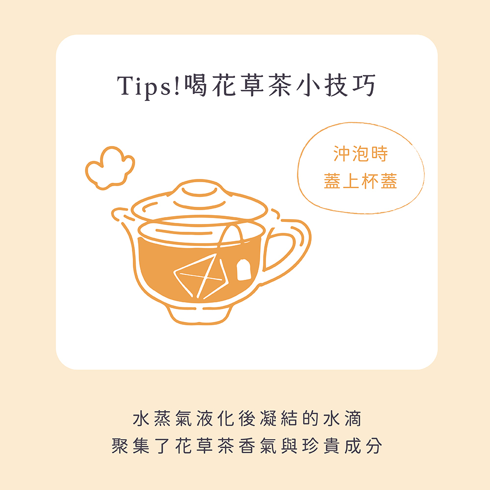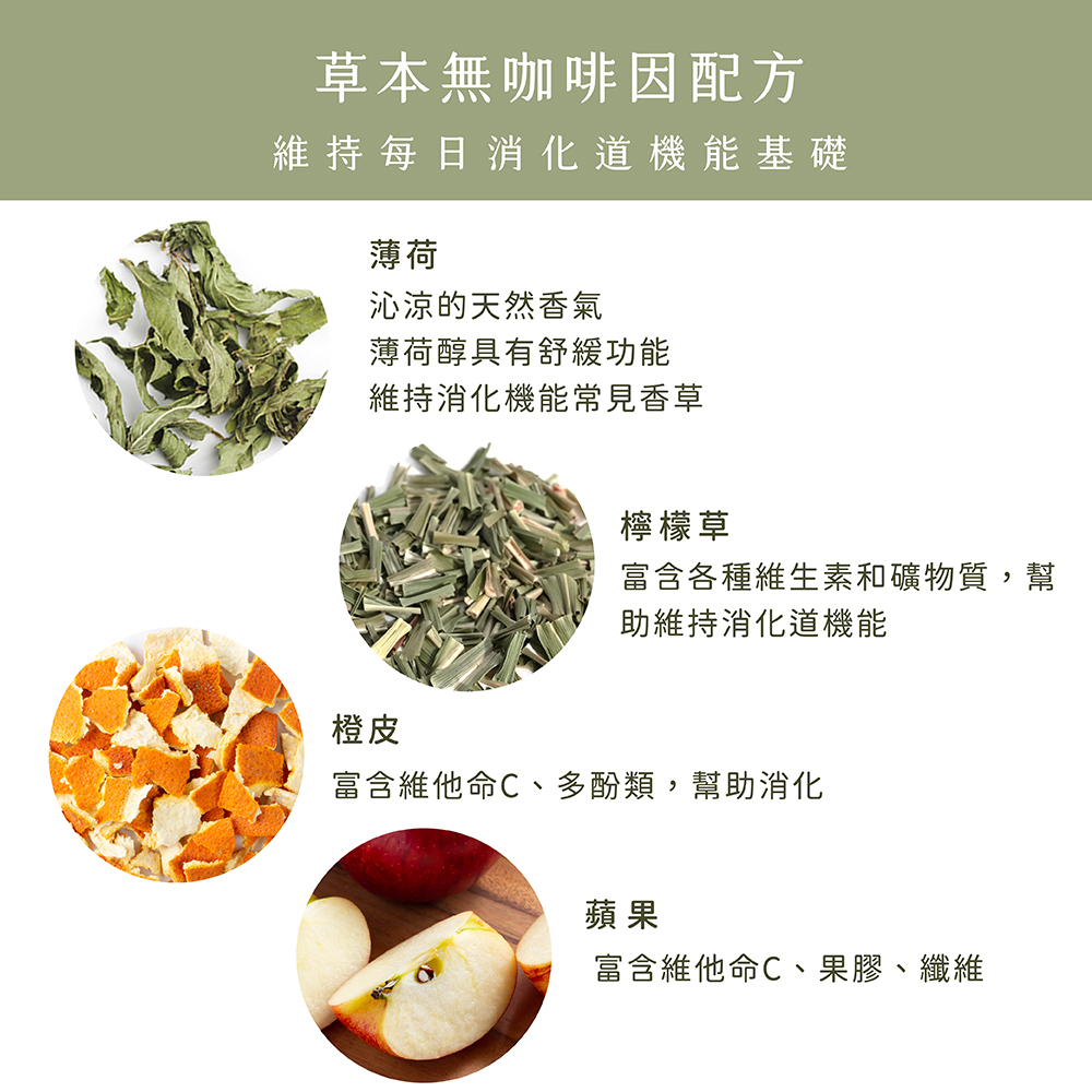 以薄荷、橙皮、蘋果與檸檬草等花草複方調配,沖泡後散發清新明亮的薄荷與柑橘香氣,口感舒爽清涼尾韻帶有蘋果香甜,添加西班牙大廠研發取得歐盟專利的 CECT8145 益生菌,熱沖泡後(熱減话)的菌體仍保有相同功能,可幫助促進新陳代謝,改變細菌叢生態。