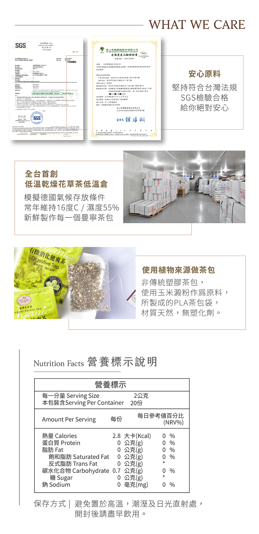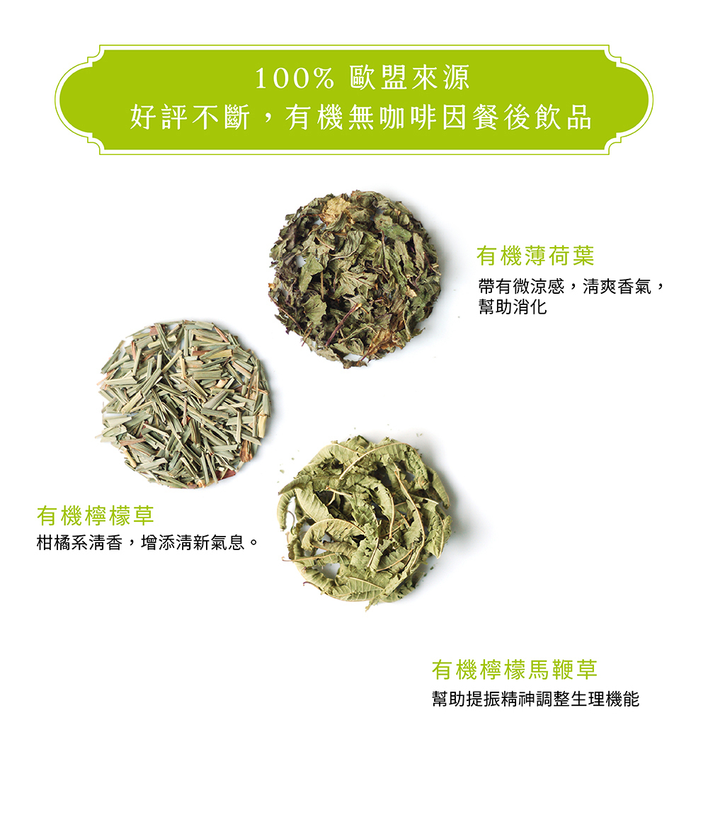 成 分:有機薄荷複方茶 (有機薄荷葉、有機甘草根、有機檸檬草、有機檸檬馬鞭草)