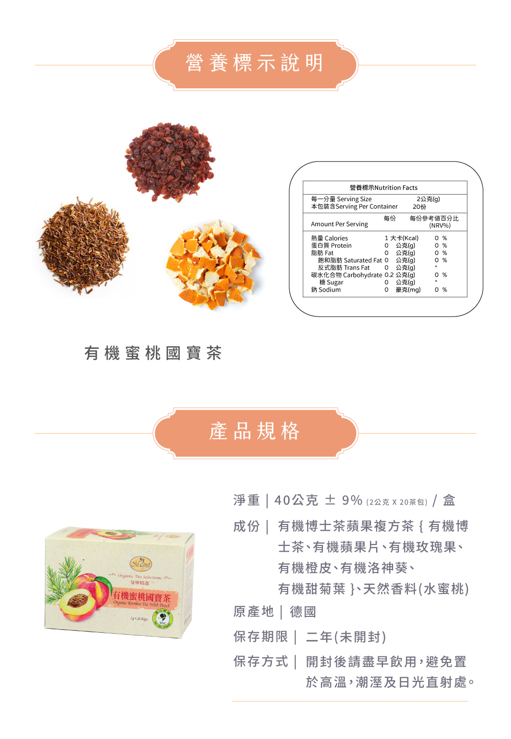 成 分:有機博士茶蘋果複方茶 (有機博士茶、有機蘋果片、有機玫瑰果、有機橙皮、有機洛神葵、有機甜菊葉)、天然香料(水蜜桃)