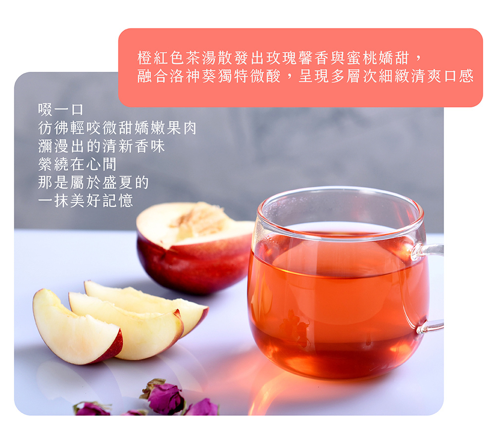 ◆ 橙紅色茶湯散發玫瑰馨香與蜜桃嬌甜,融合洛神葵獨特微酸,呈現多層次細緻清爽口感。