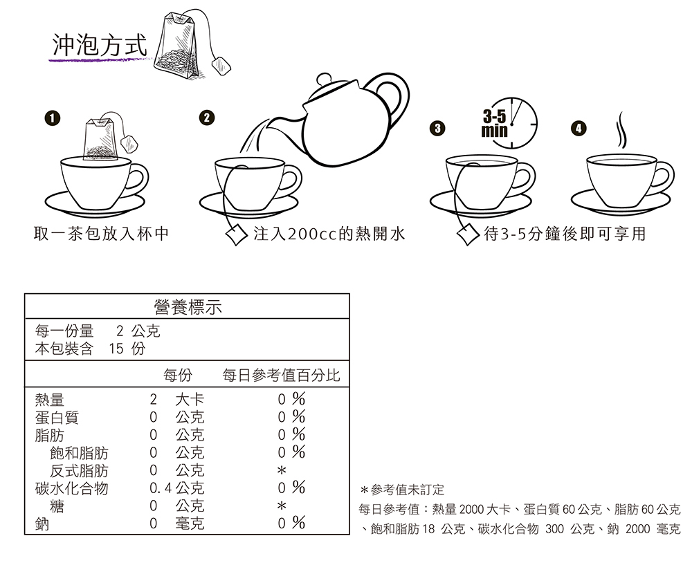 淨 重:22.5公克 ± 9% (1.5公克 X 15茶包) / 盒