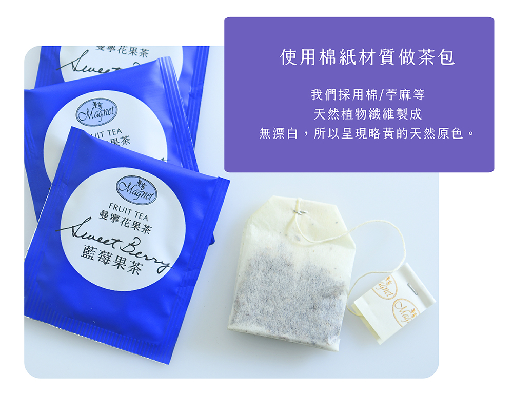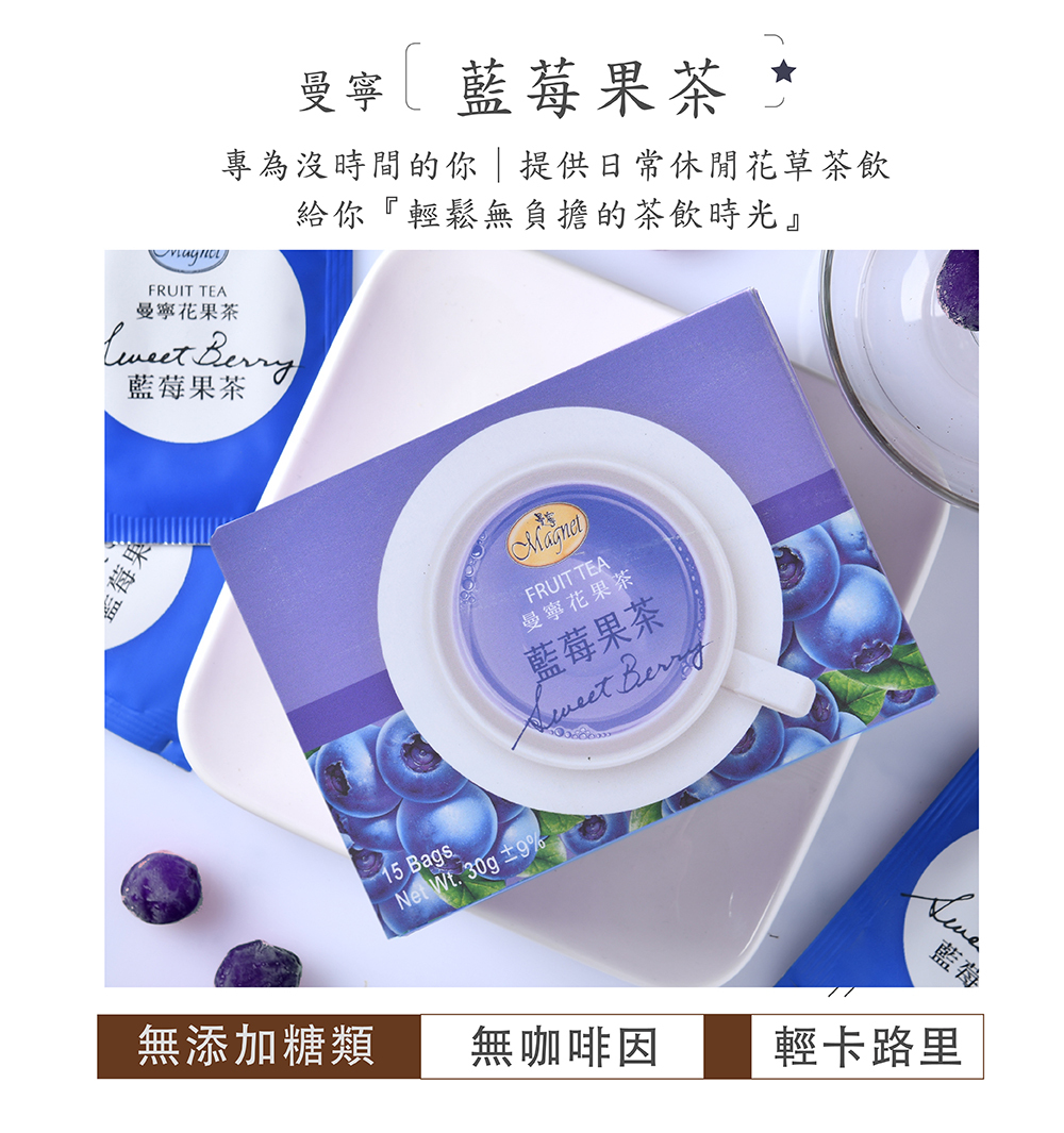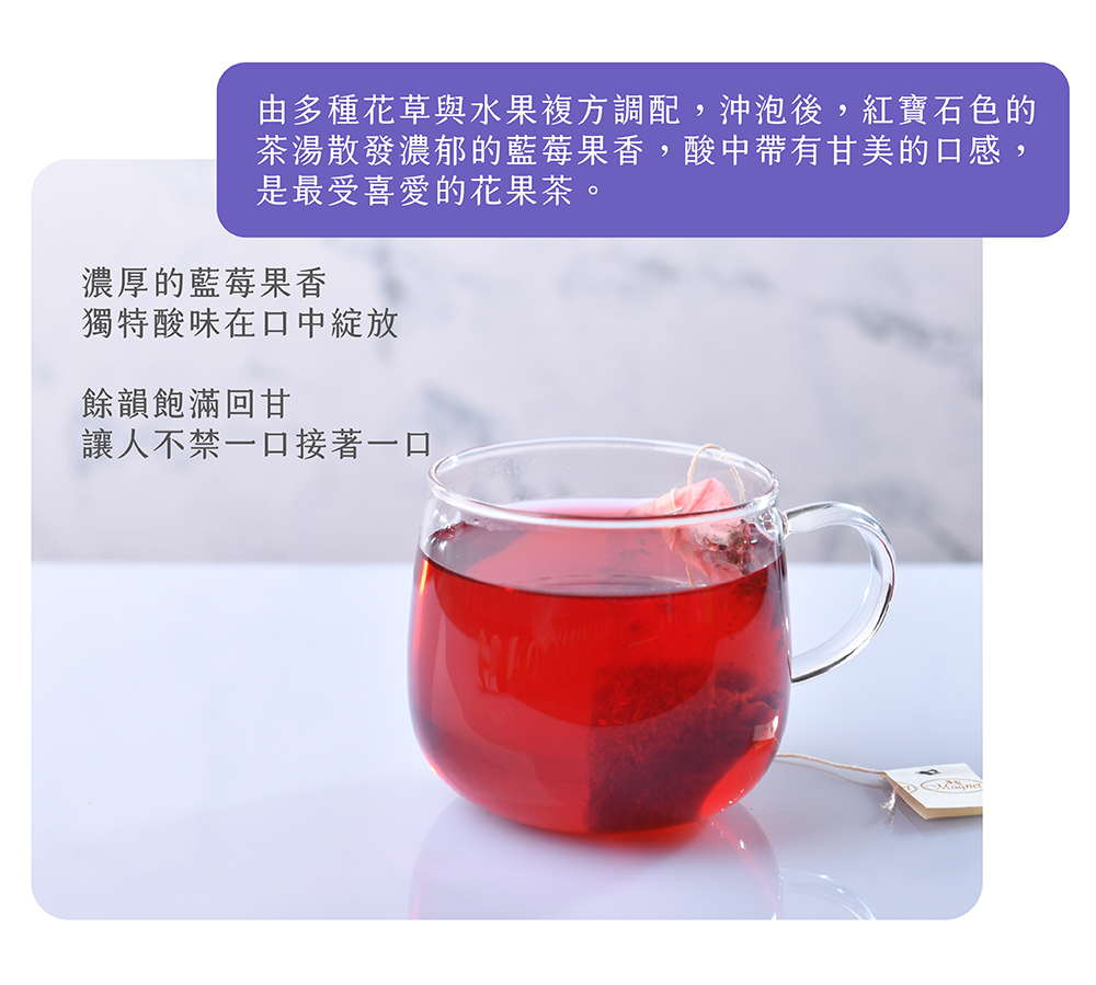 ◆由多種花草與水果複方調配,沖泡後,紅寶石色的茶湯散發濃郁的藍莓果香,酸中帶有甘美的口感,是最受喜愛的花果茶。