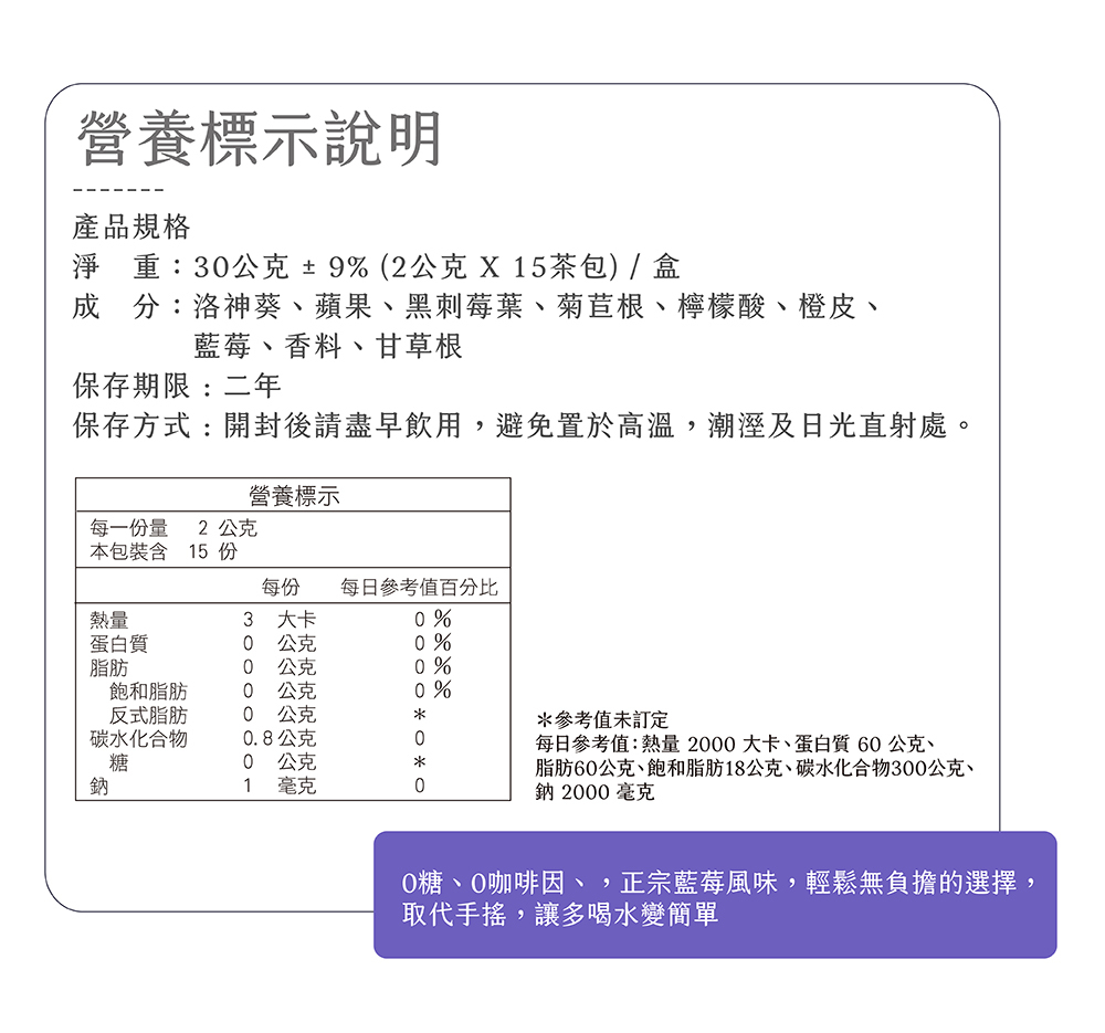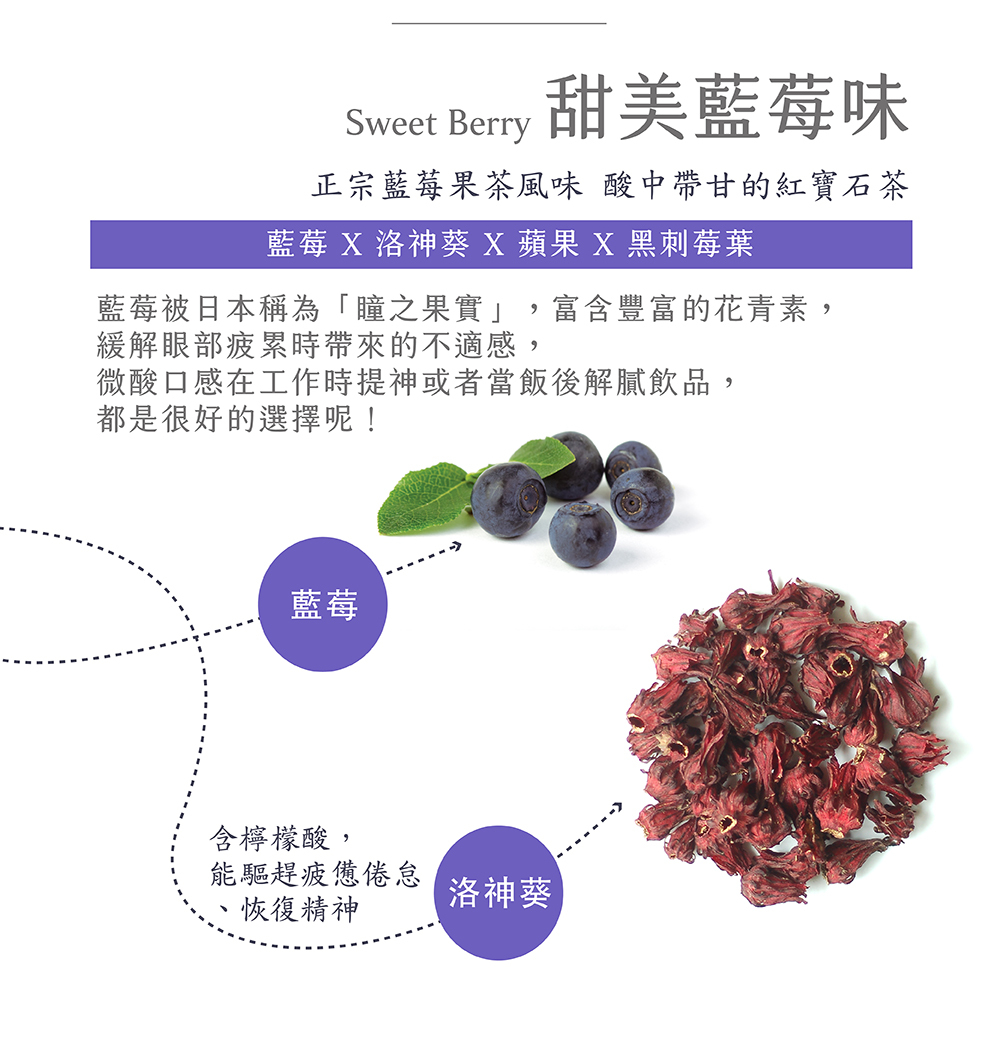 成 分:洛神葵、蘋果、黑刺莓葉、菊苣根、檸檬酸、橘皮、藍莓、香料、甘草根